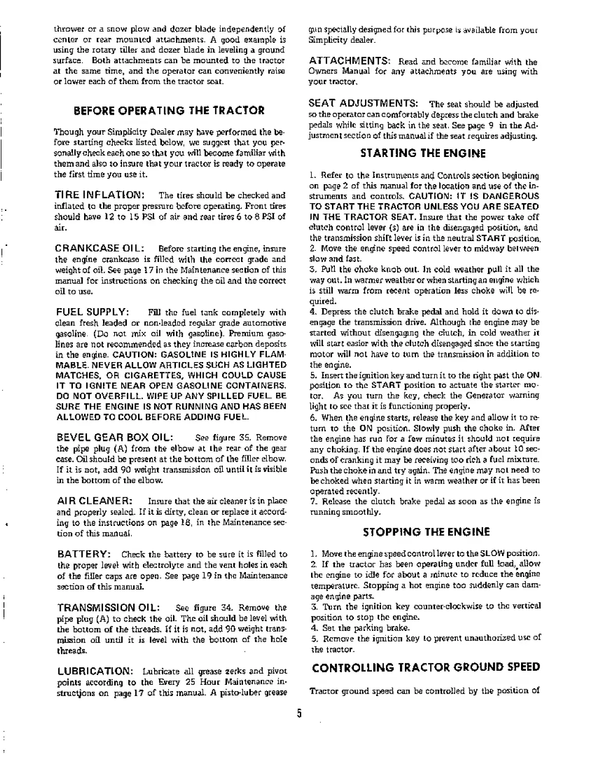 Simplicity SOVEREIGN 3415S - Before Operating the Tractor; Starting the Engine; Stopping the Engine; Controlling Tractor Ground Speed