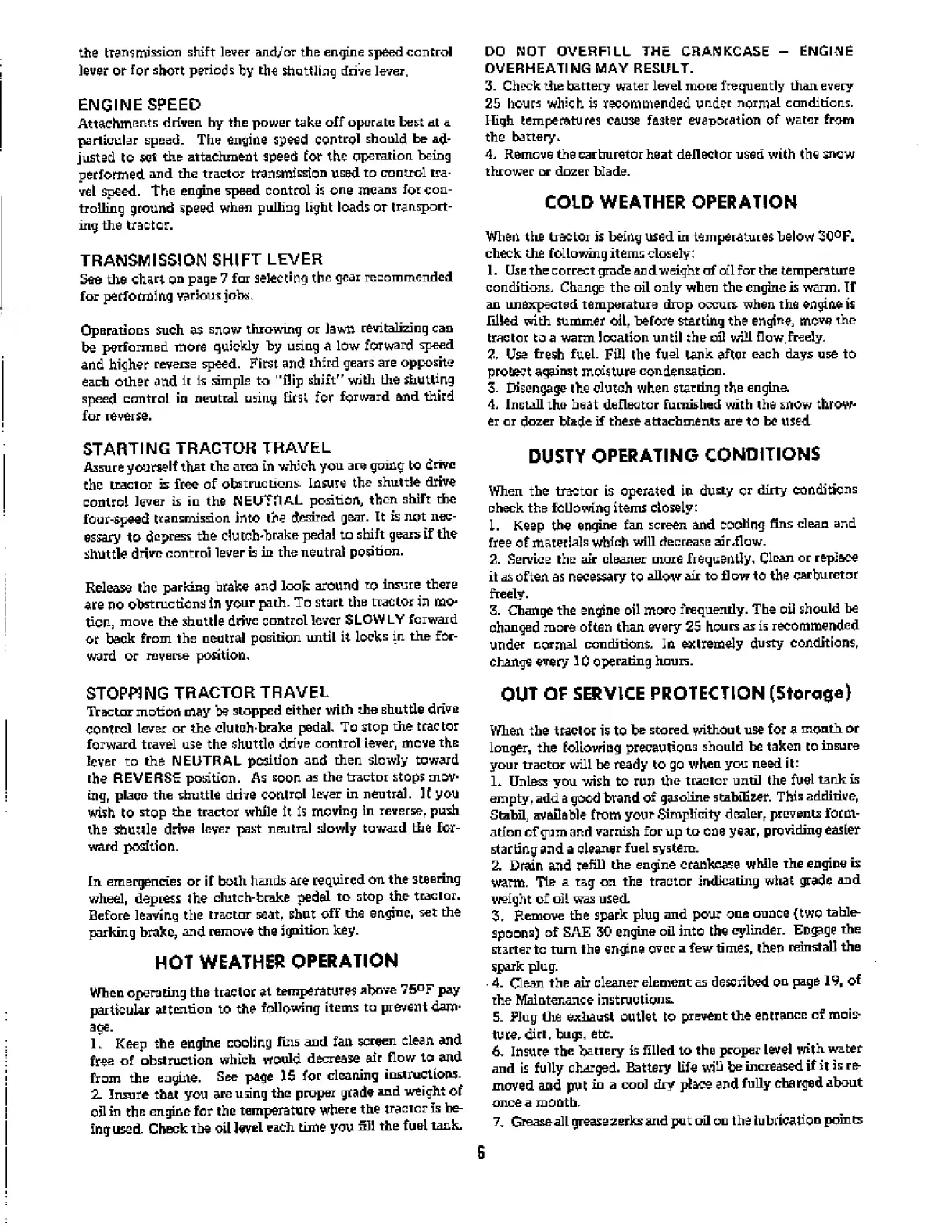 Simplicity SOVEREIGN 3415S - Hot Weather Operation; Cold Weather Operations; Dusty Operating Conditionss; Out of Service Protection (Storage)
