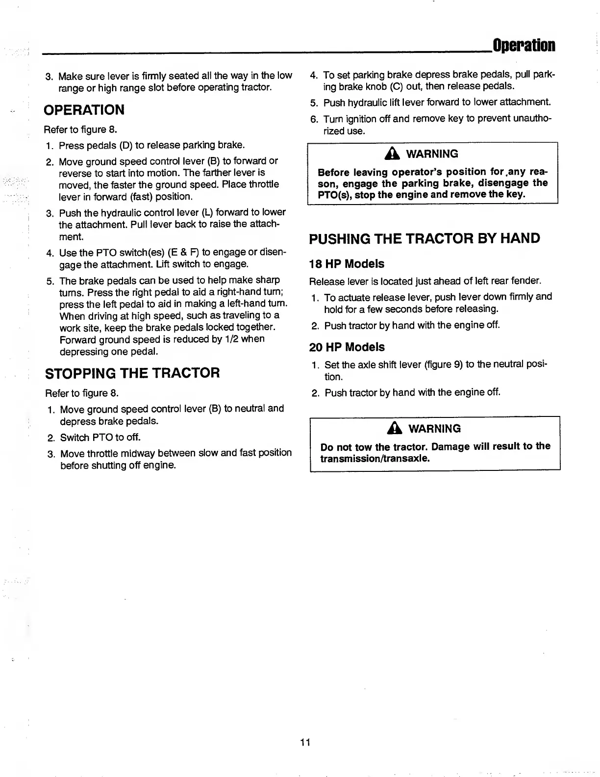 Simplicity SunStar 1692521 - Stopping the Tractor.11; Pushing the Tractor by Hand.11