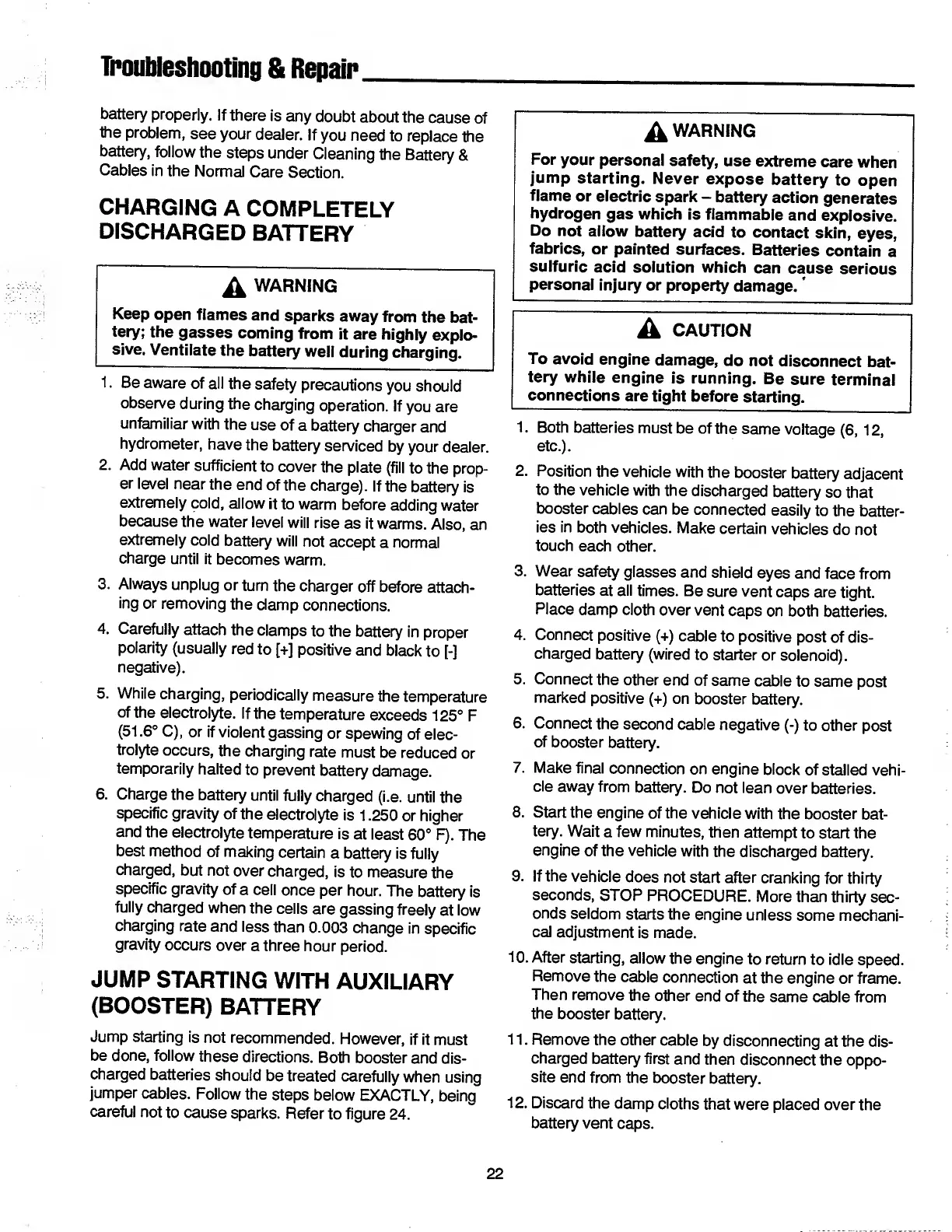 Simplicity SunStar 1692521 - Charging a Completely; Discharged Battery.22; Jump Starting with Auxiliary (Booster) Battery.22