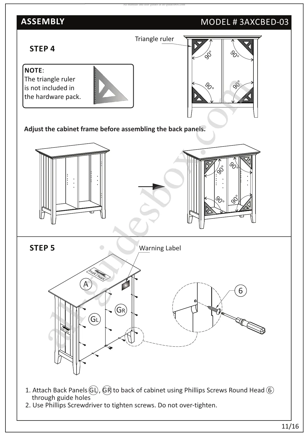 1. Attach Back Panels GL , GR to back of cabinet using Phillips Screws Round Head 6