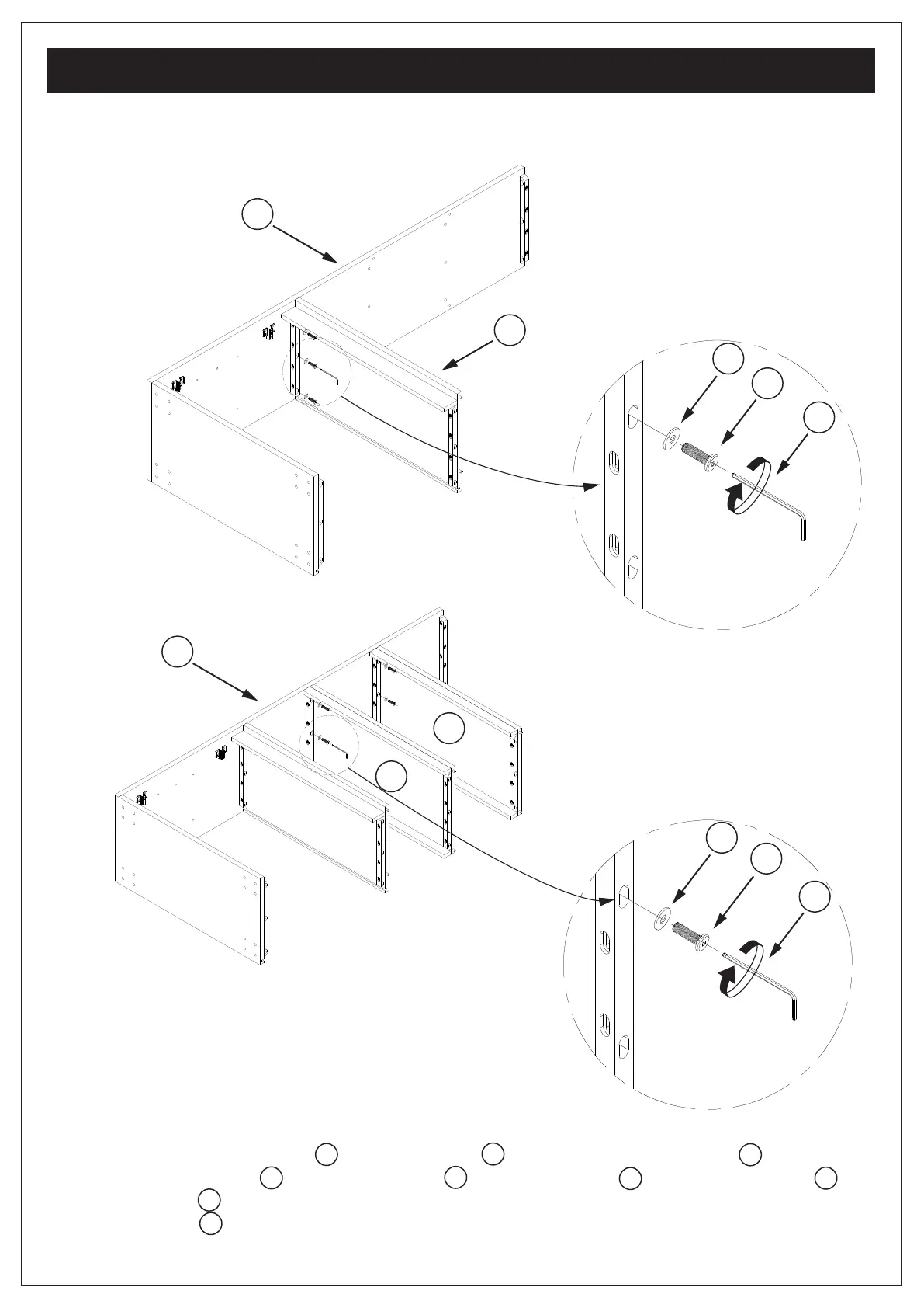 2. Attach Bottom Shelf E and Middle Shelves D to Left Side Panel A using Allen Key Bolts 1