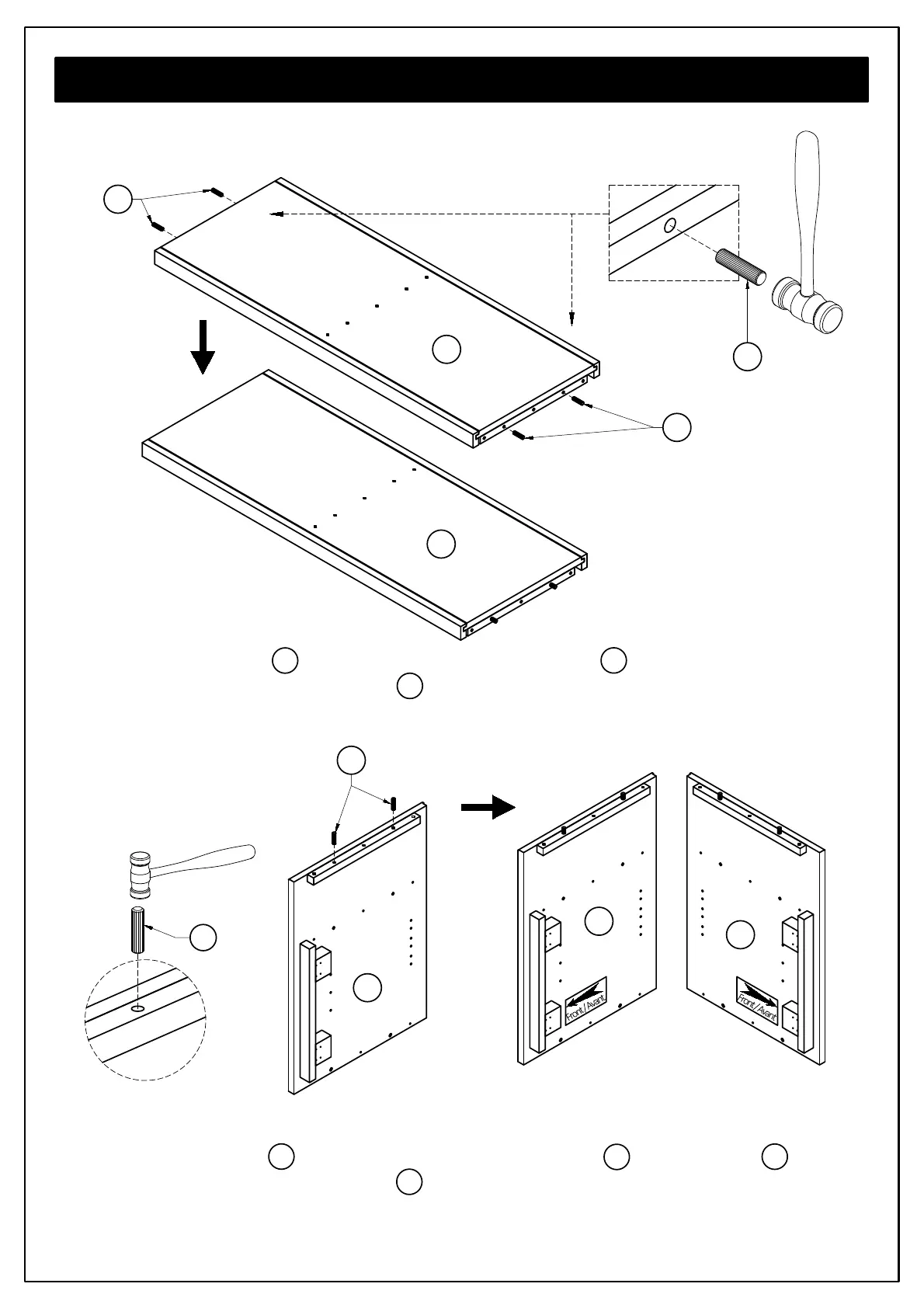 2. Use rubber mallet to tap Dowels 2 into bottom of holes securely. 1/2 length of