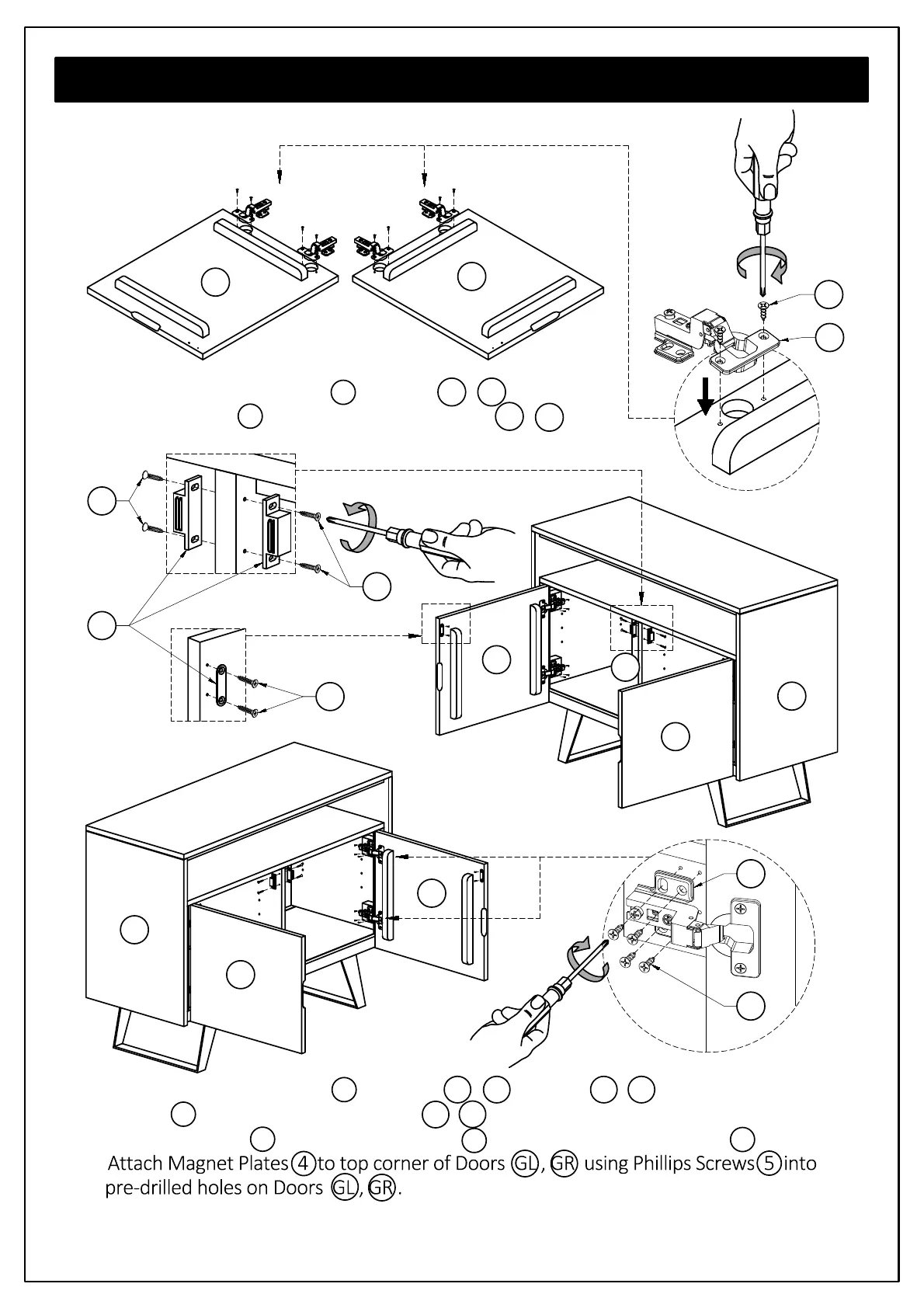 4. Attach Magnet Plates 4 to top corner of Doors GL , GR using Phillips Screws 5 into