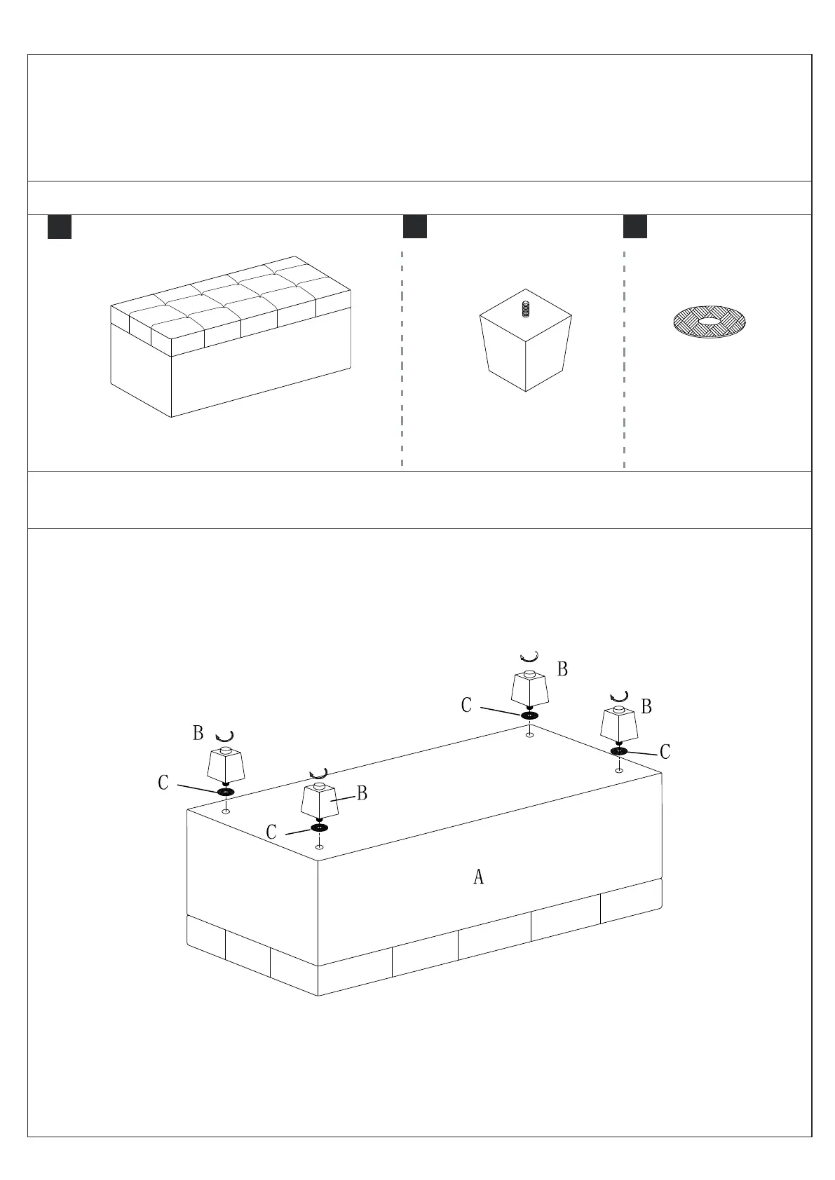 Place Ottoman (A) on its back on a flat smooth surface.Attach the Feet (B) with Washers (C) on each corner.