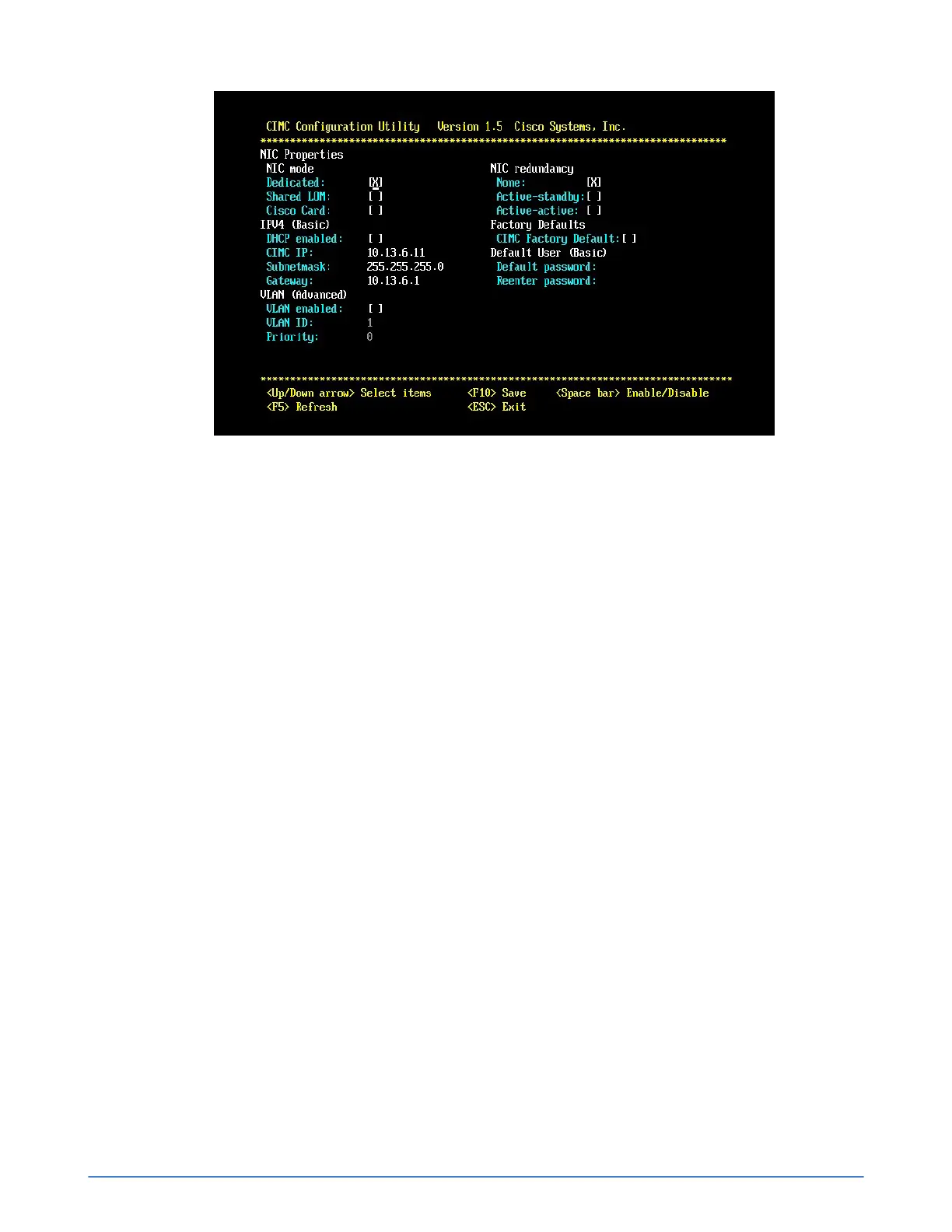 5. Move to the Dedicated: field, under NIC Properties, NIC mode. Press the space bar to enable