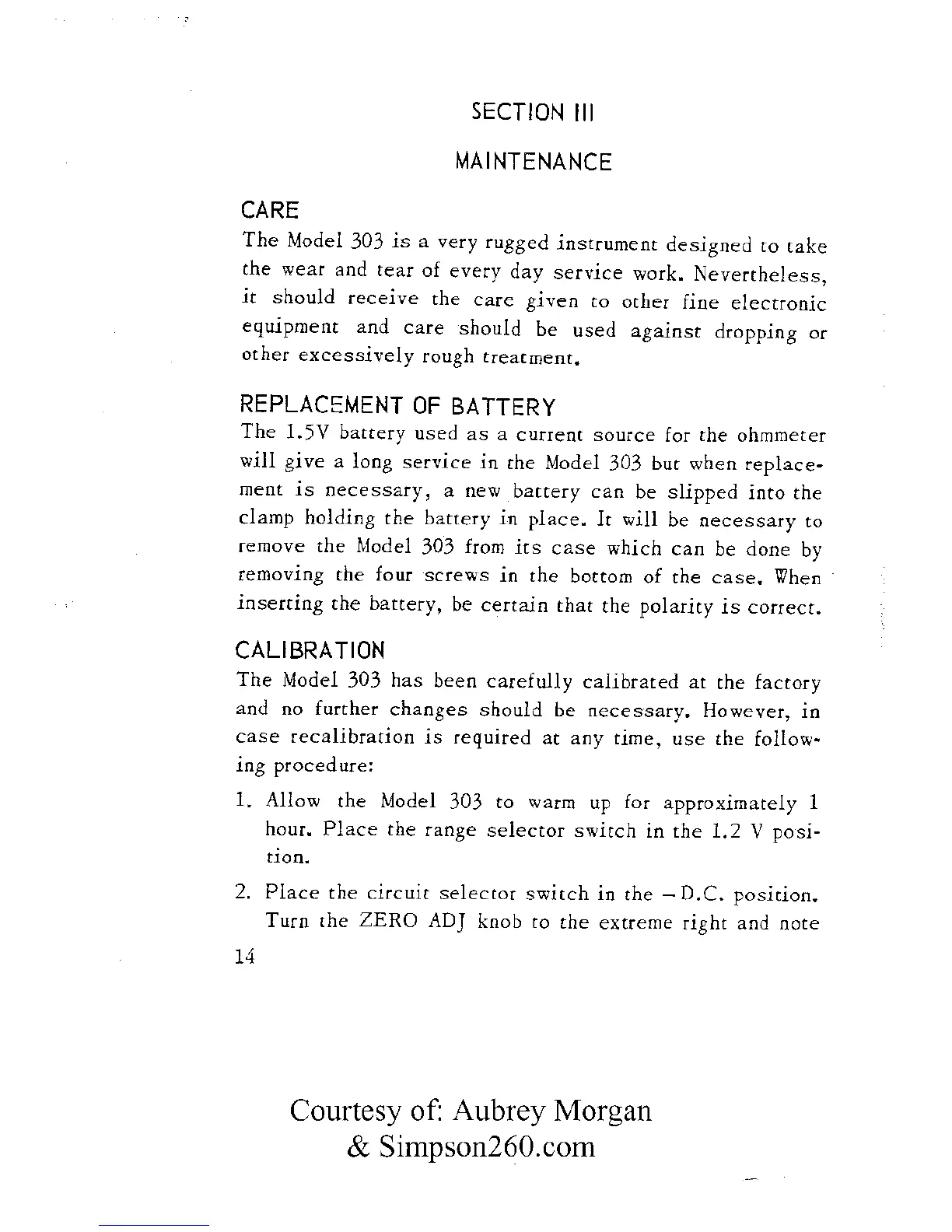 Simpson Electric 303 - Section III: Maintenance; Battery Replacement; Calibration Procedure