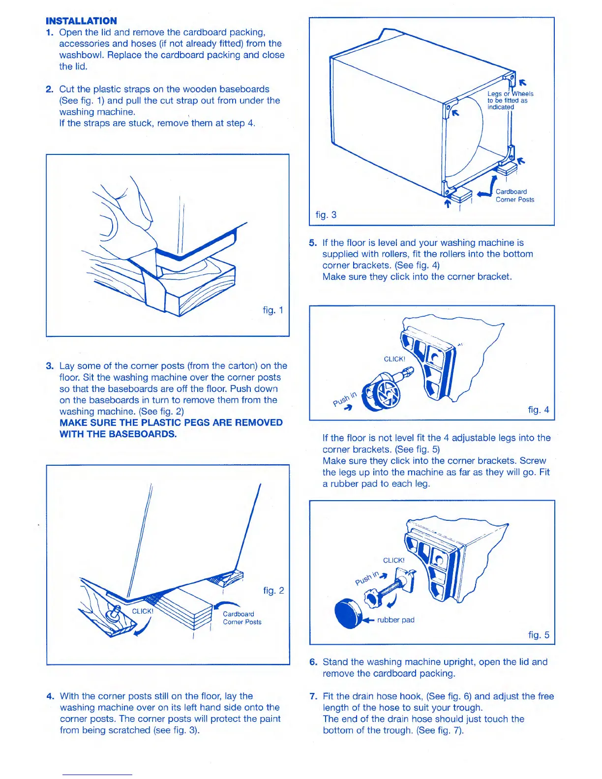 Fit the drain hose hook, (See fig. 6) and adjust the free