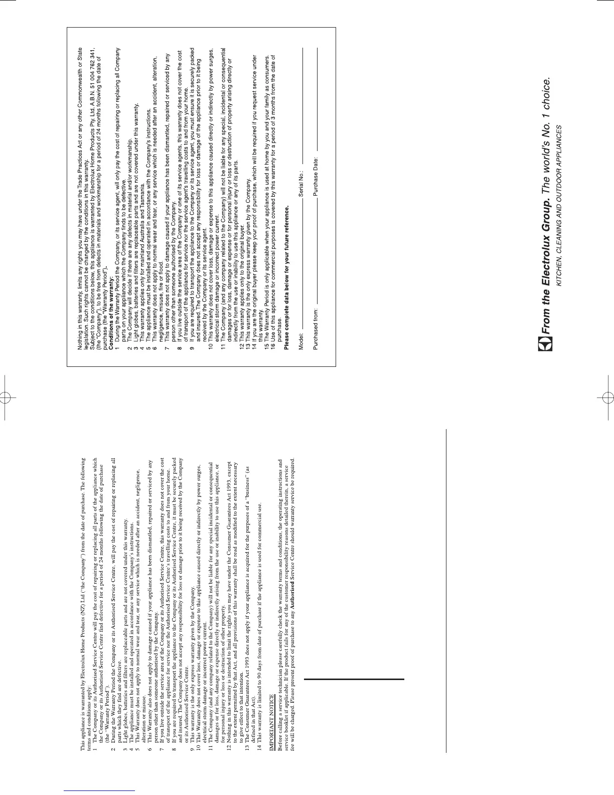 Electrolux Home Products (NZ) Ltd. 3-5 Niall Burgess Road, Mt. Wellington ...................(09) 573 2220