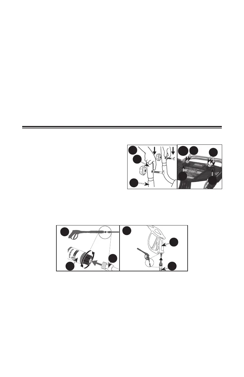 6. Attach high pressure hose (C) to gun (D). Tighten se cure ly.