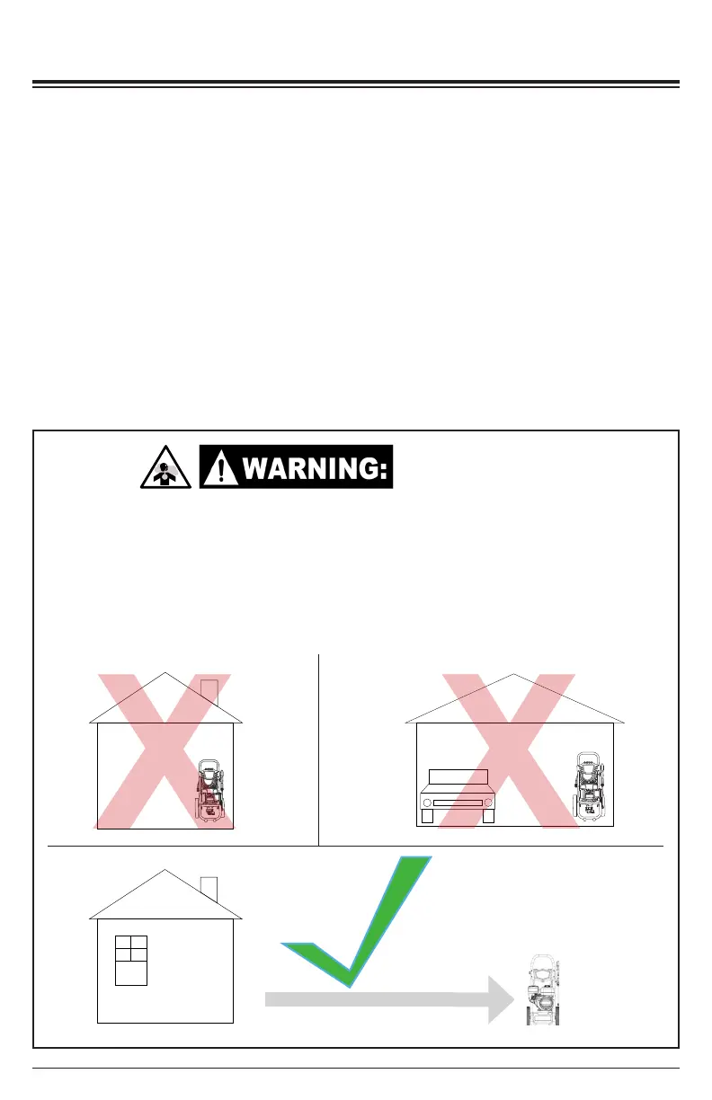 ● Never use pressure washer inside a house, garage, or any other kind of enclosure even