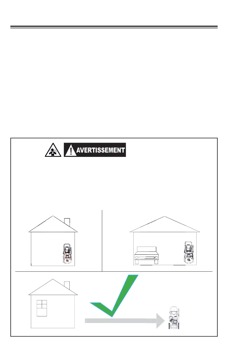 ● N’utilisez jamais le laveur sous pression à l’intérieur d’une maison, d’un garage ou de tout autre