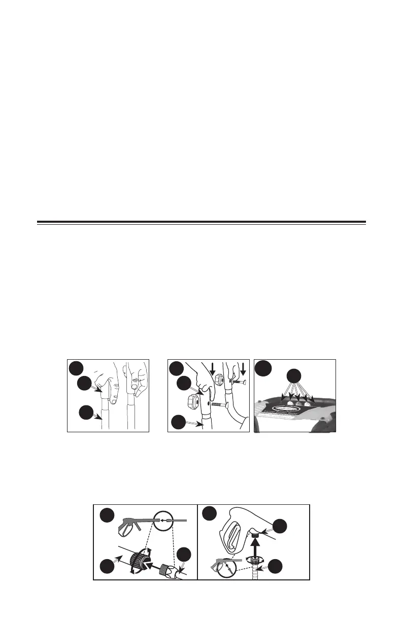 6. Conecte la manguera de alta presión (C) a la pistola (D) y ajústela firmemente.