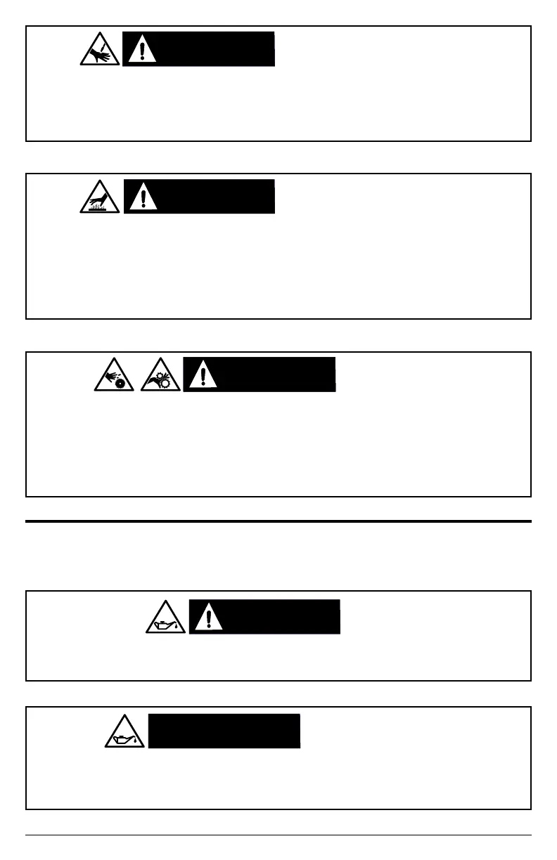 injury, never place ngers, hands, feet, or other body parts near running engine. Never