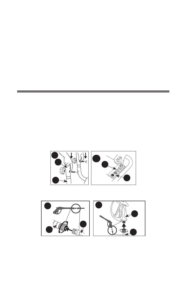6. Conecte la manguera de alta presión (C) a la pistola (D) y ajústela firmemente.