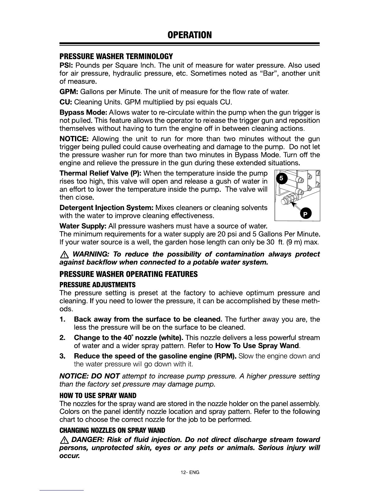 Simpson PS4033 - Operation; Pressure Washer Terminology; Pressure Adjustments; Changing Nozzles on Spray Wand