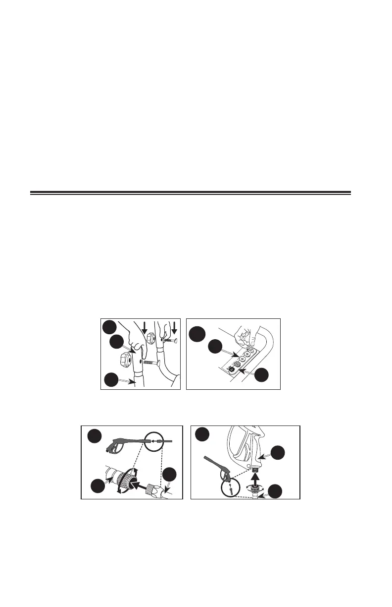 6. Conecte la manguera de alta presión (C) a la pistola (D) y ajústela firmemente.