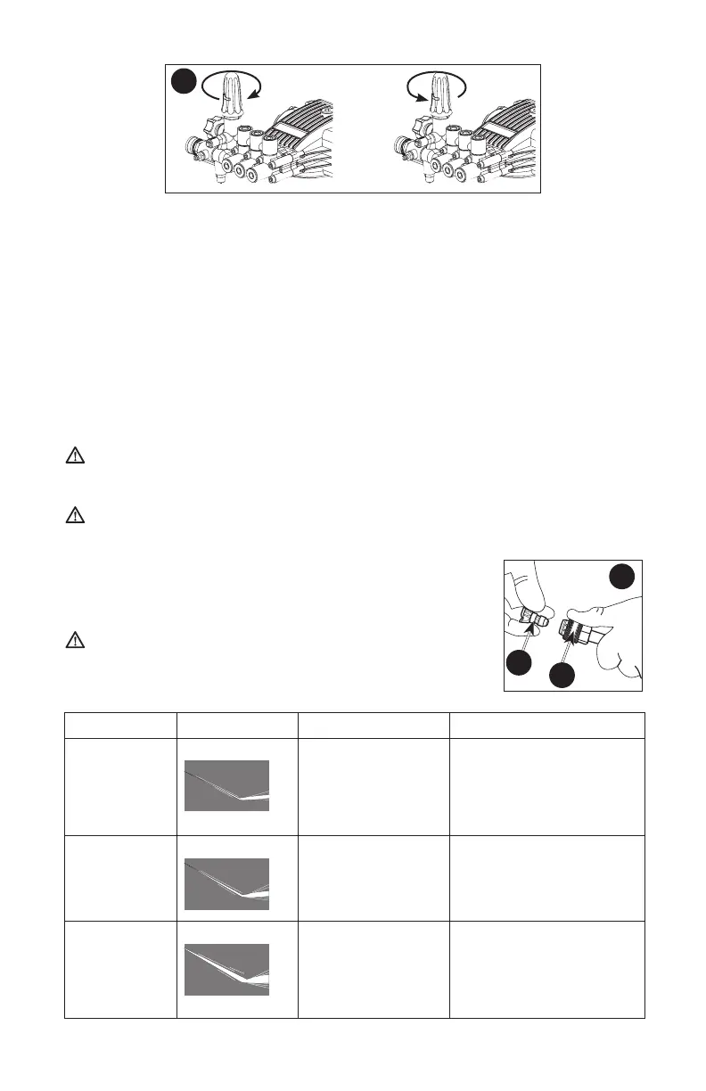 attempt to change nozzles while pressure washer is running. Turn engine off