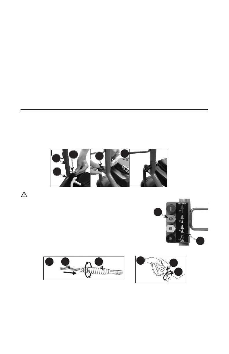 6. Conecte la manguera de alta presión (C) a la pistola (D) y ajústela firmemente.