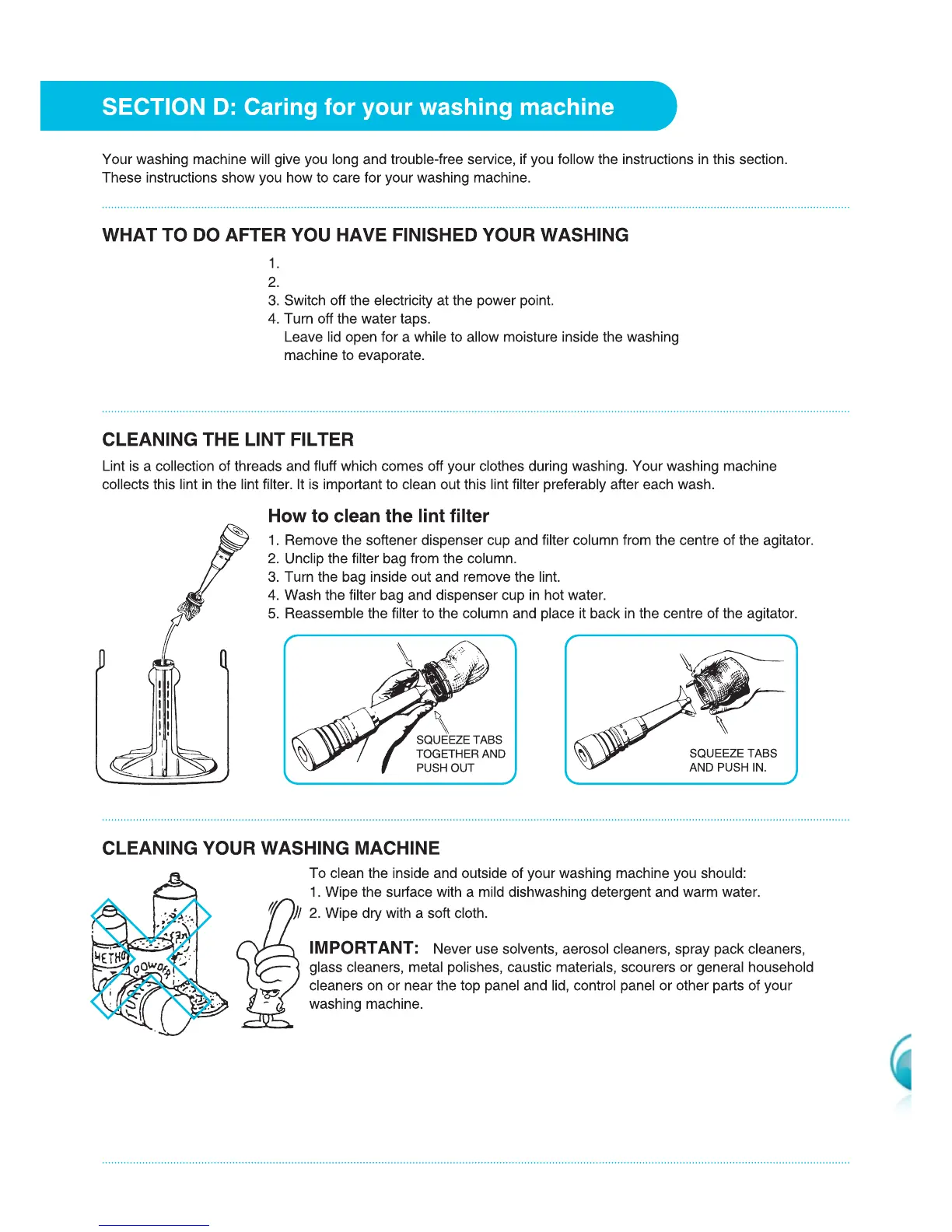 Simpson SWT704 - Caring for Your Washing Machine; Post-Wash Procedures; Cleaning the Lint Filter; Cleaning the Machine Exterior