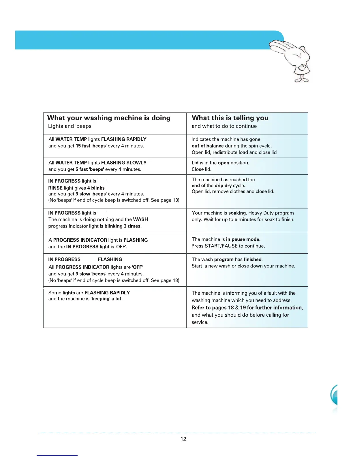 The washing machine will give you information by using the control panel lights and the ‘beeping’ function.