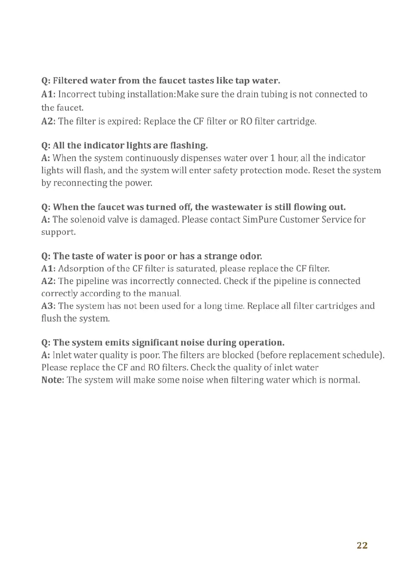 SimPure Q3-600 - Filtered Water Taste Issue; All Indicator Lights Flashing; Wastewater Still Flowing; Poor Water Taste or Odor