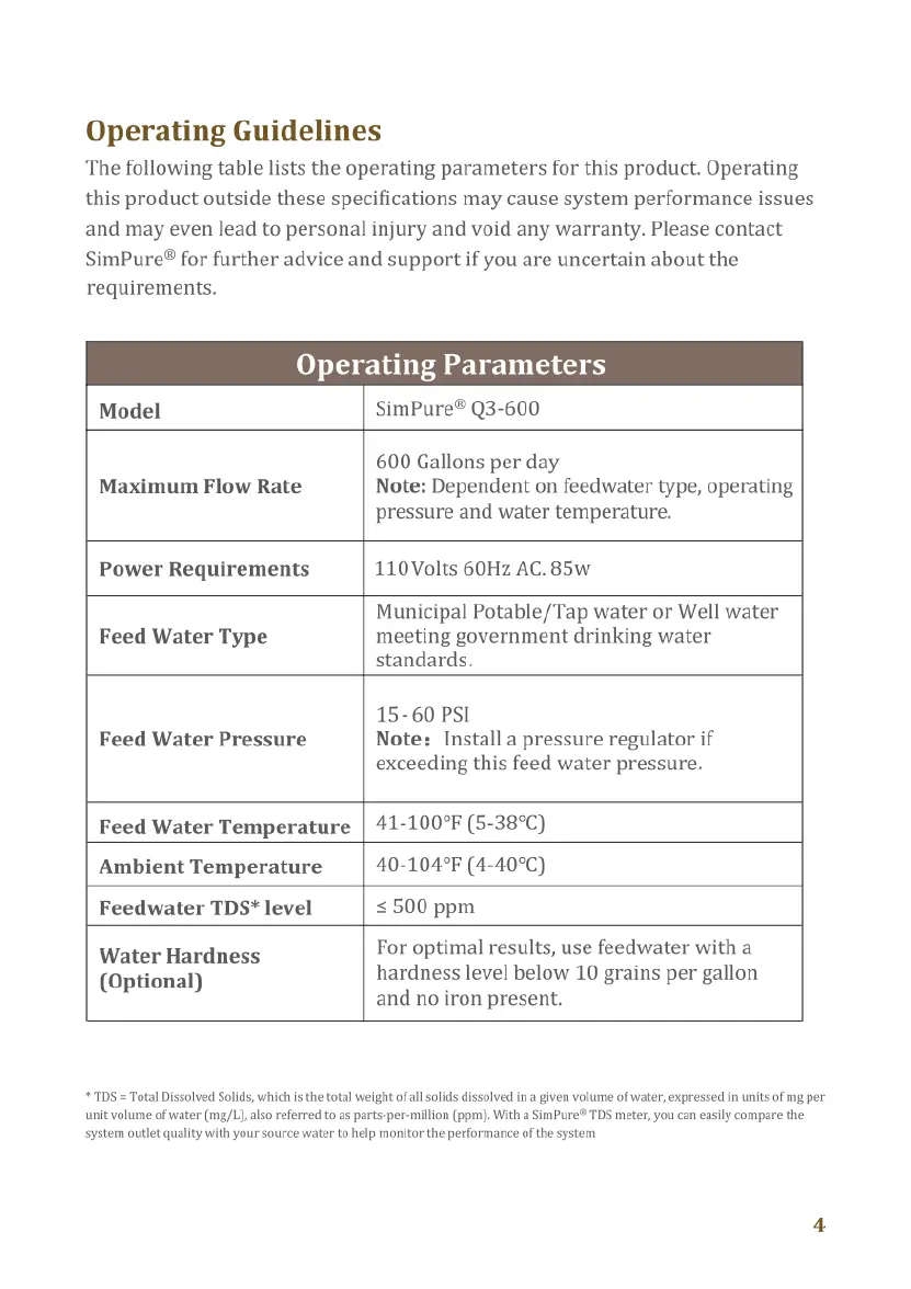 SimPure Q3-600 - Operating Parameters and Specifications; System Operating Specifications