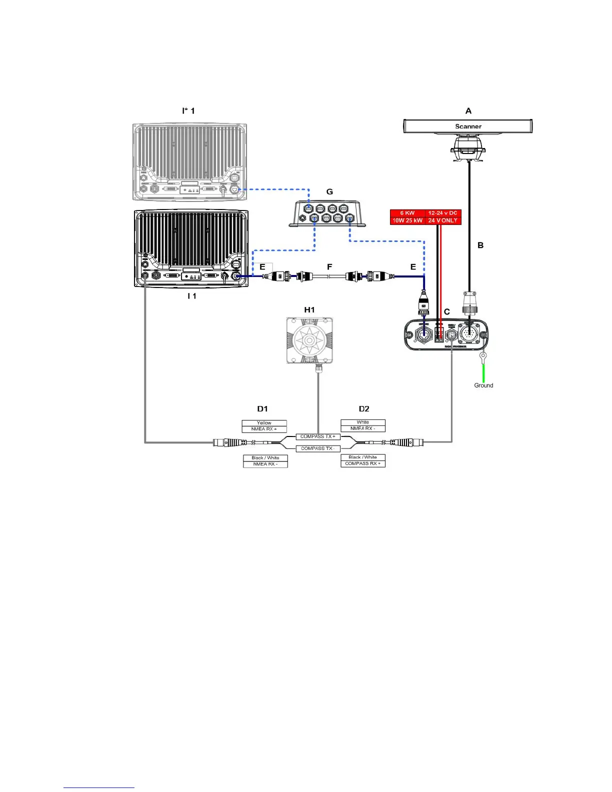 The diagram below shows how to connect the radar to a Northstar 8000i or Simrad GB40