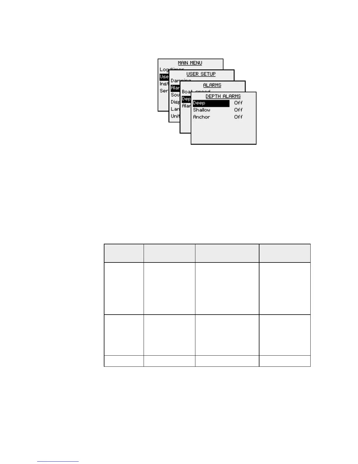 The depth alarm can be set up for deep and shallow