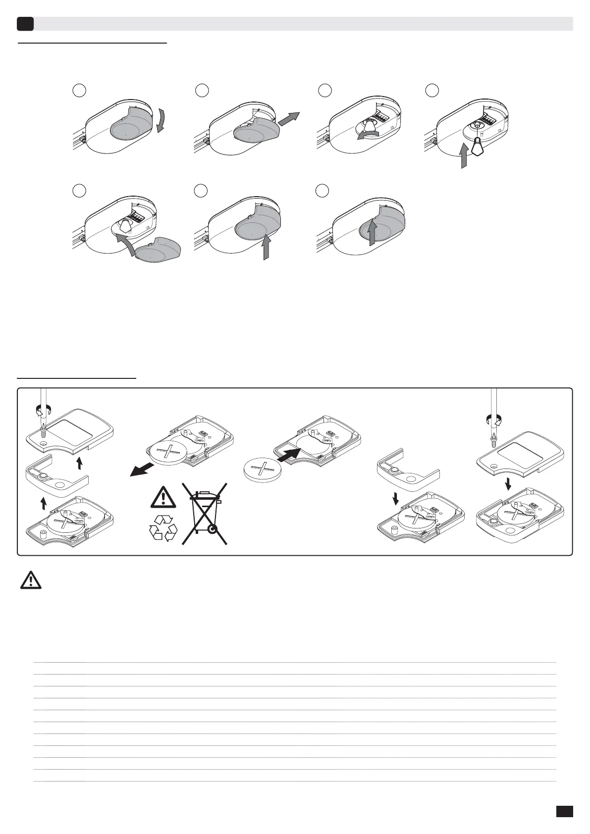 WARNING: respect polarities (+/–), don’t recharge, don’t throw in fi re nor in water. do not expose to hight temperatures. Do