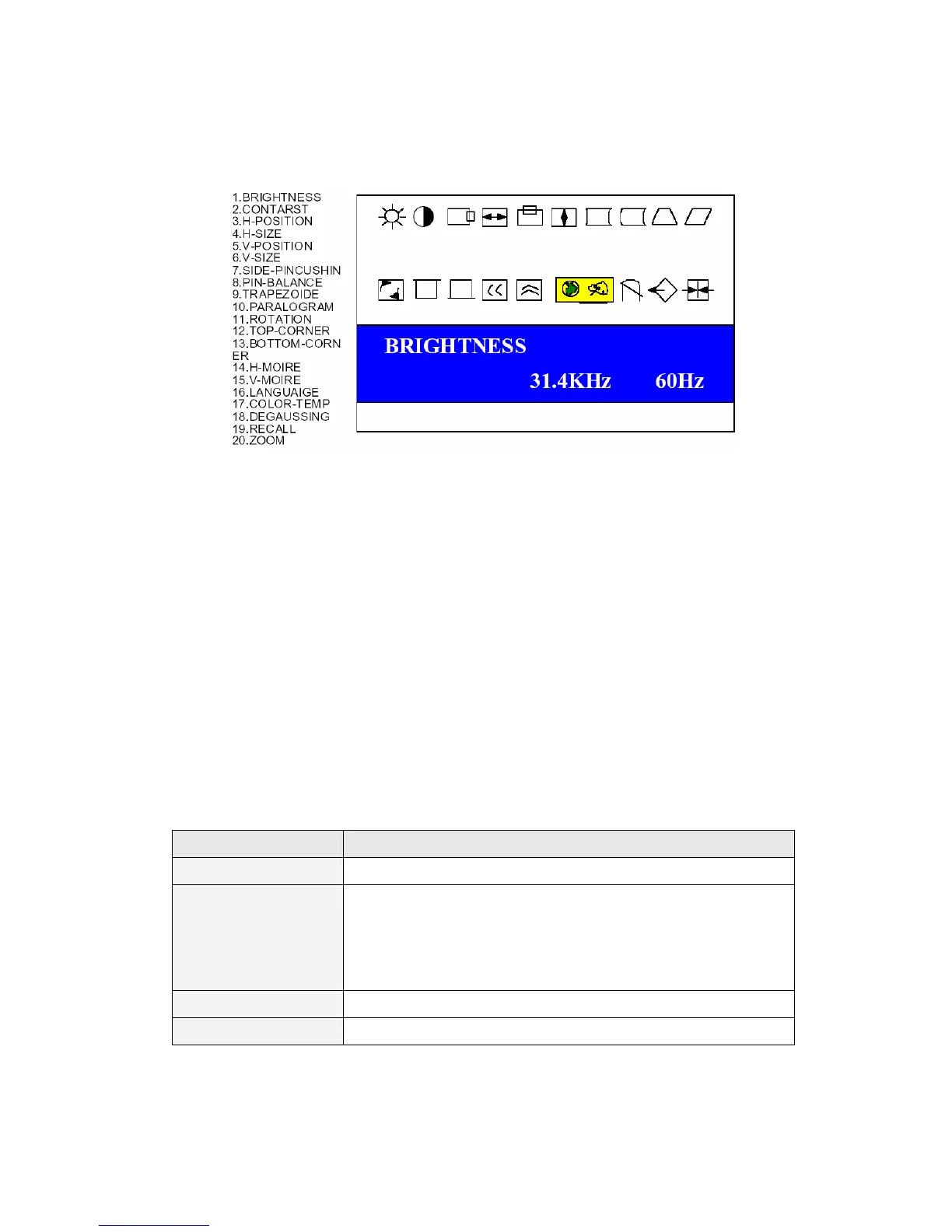 The brightness, contrast, color, alignment, sharpness, and degaussing settings for the