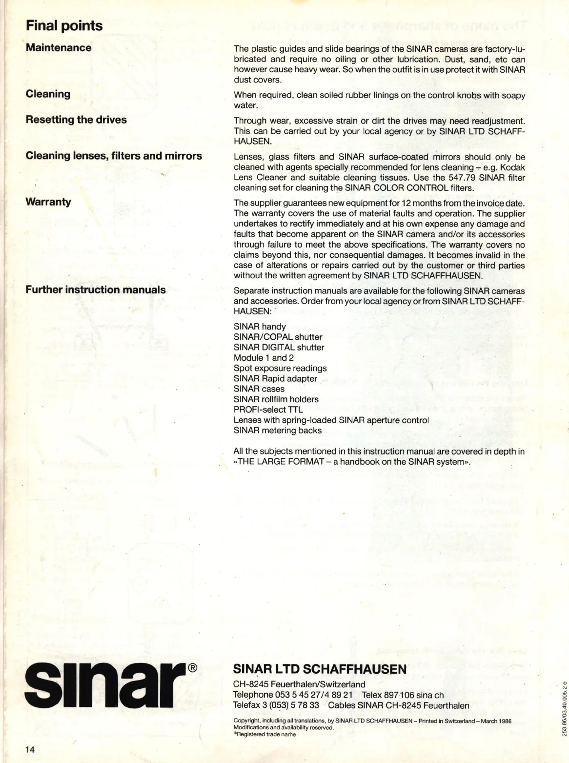 Lenses, glass filters and SINAR surface-coated mirrors should only be