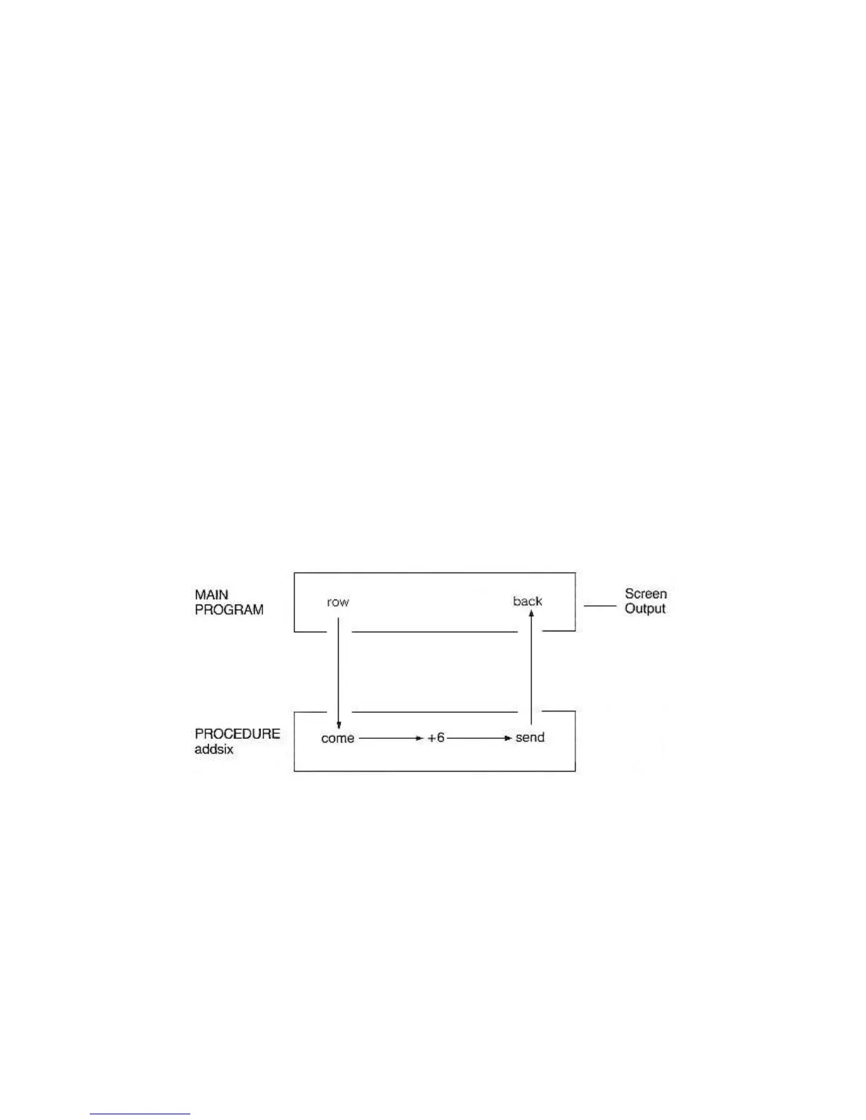 In line 40 the array row holding the numbers 1, 2, 3 is passed to the procedure, addsix. The