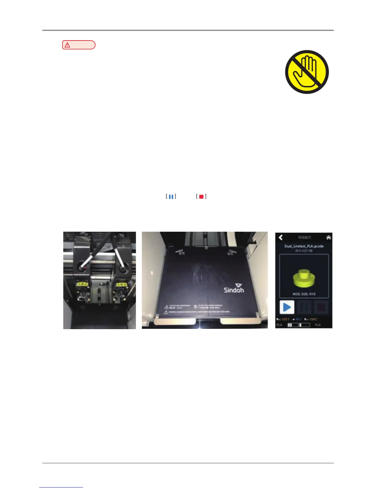 Do not put any portion of your body or objects during machine operation, as the bed, motor, nozzle