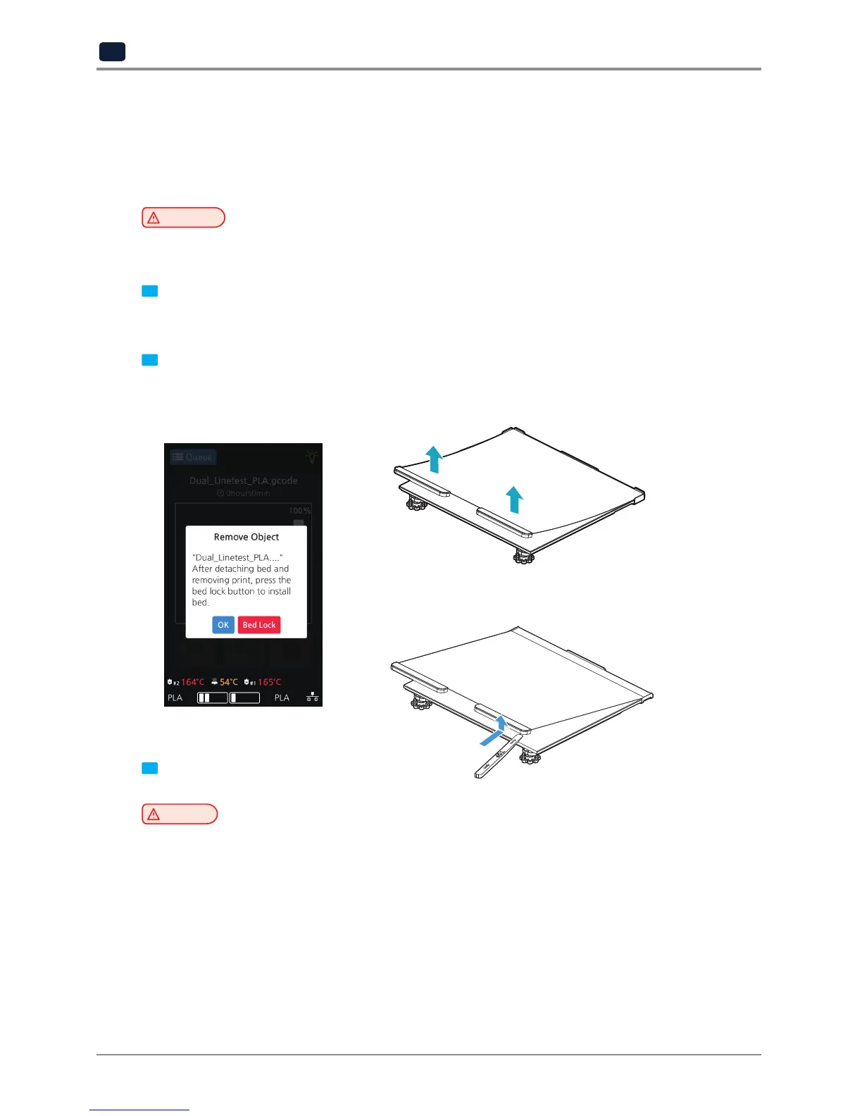 To safely detach the printed model, first let the bed cool down. Bed top plates must be detached as well.