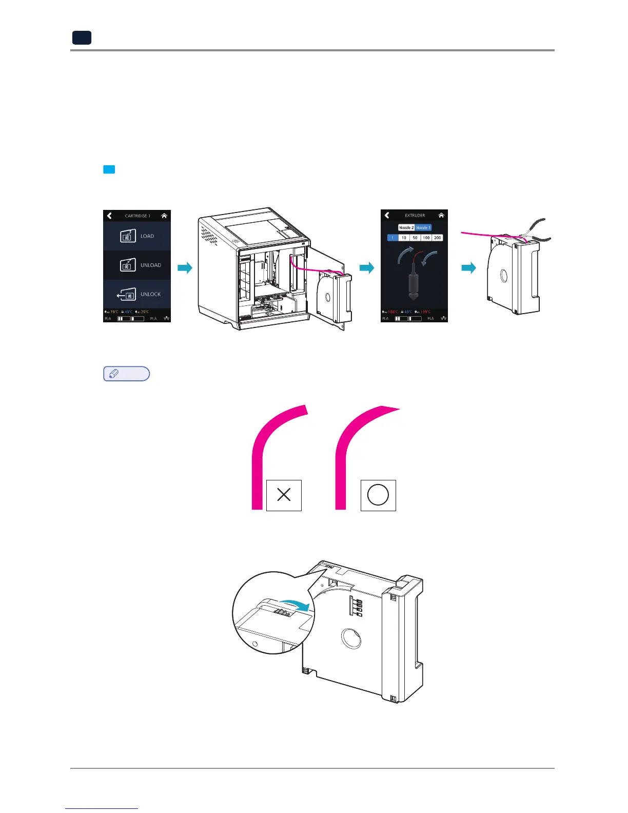 filament. Cut the removed filament, (Use below image as reference) re-install the cartridge and run LOAD.