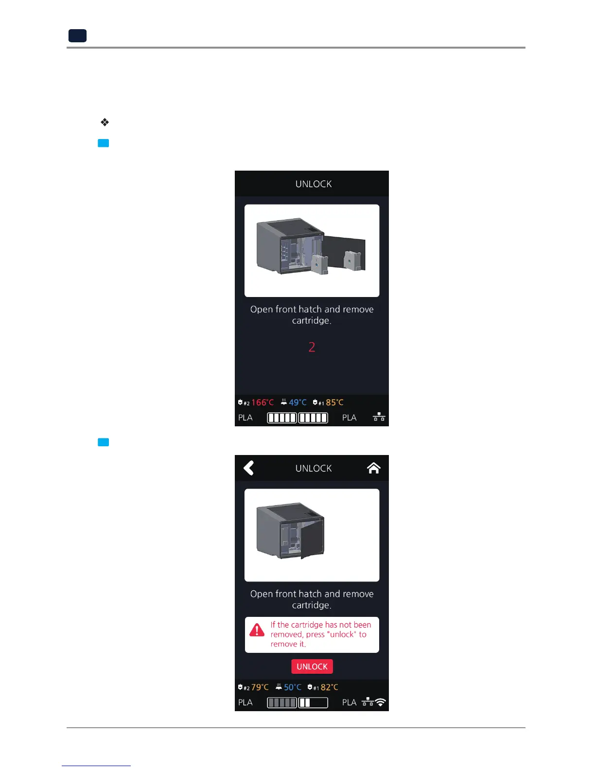 filament unload is finished. Cartridge unlock can also be manually done by the user.
