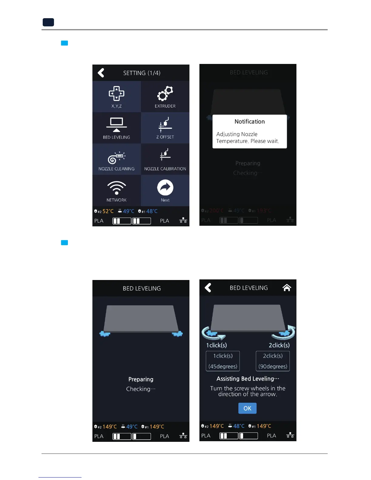 3 On the SETTING page, user is able to perform bed leveling. The bed leveling process consists of 3 steps.