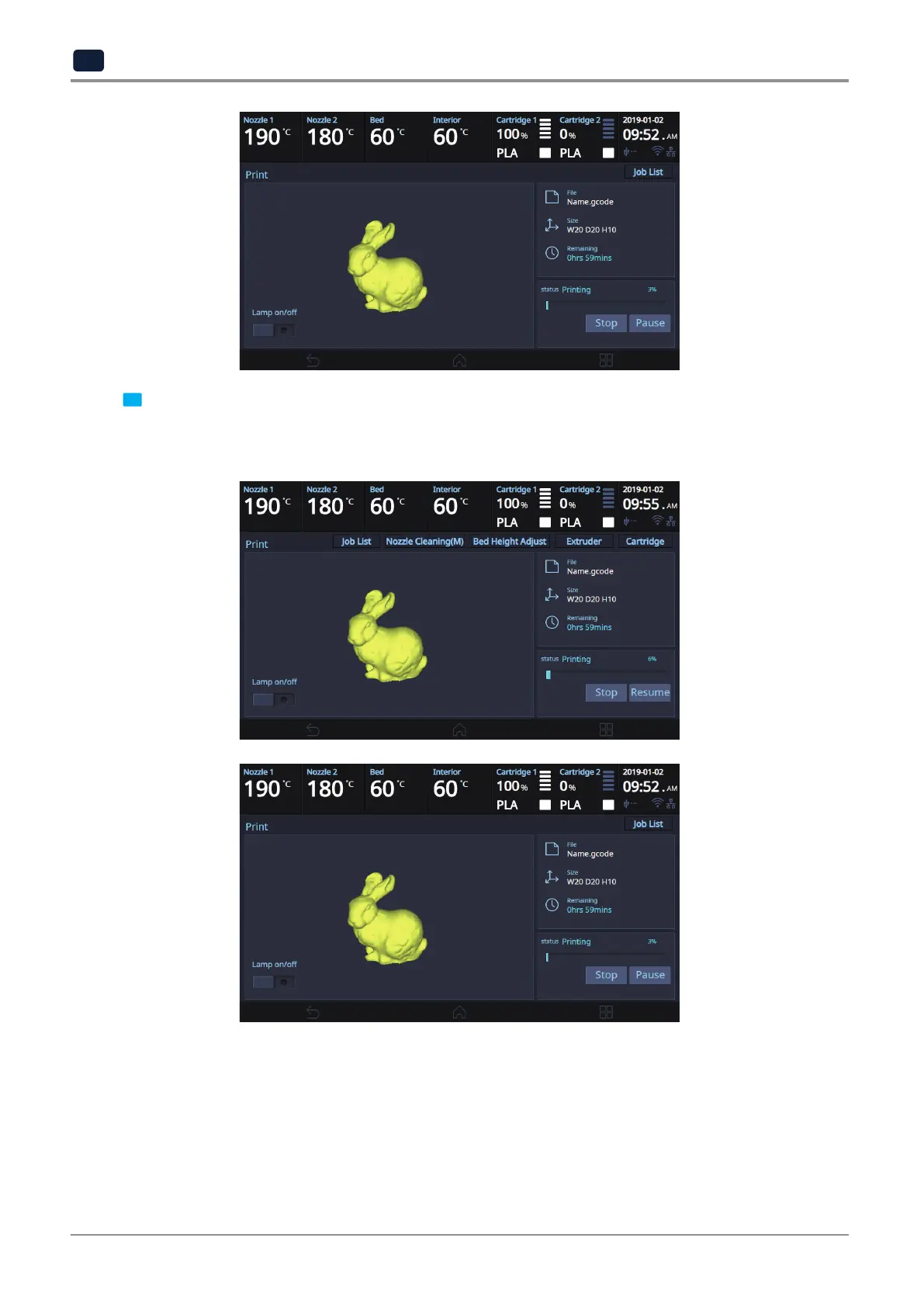 Press [Resume] again and nozzle is heated again, and the printer will continue printing.
