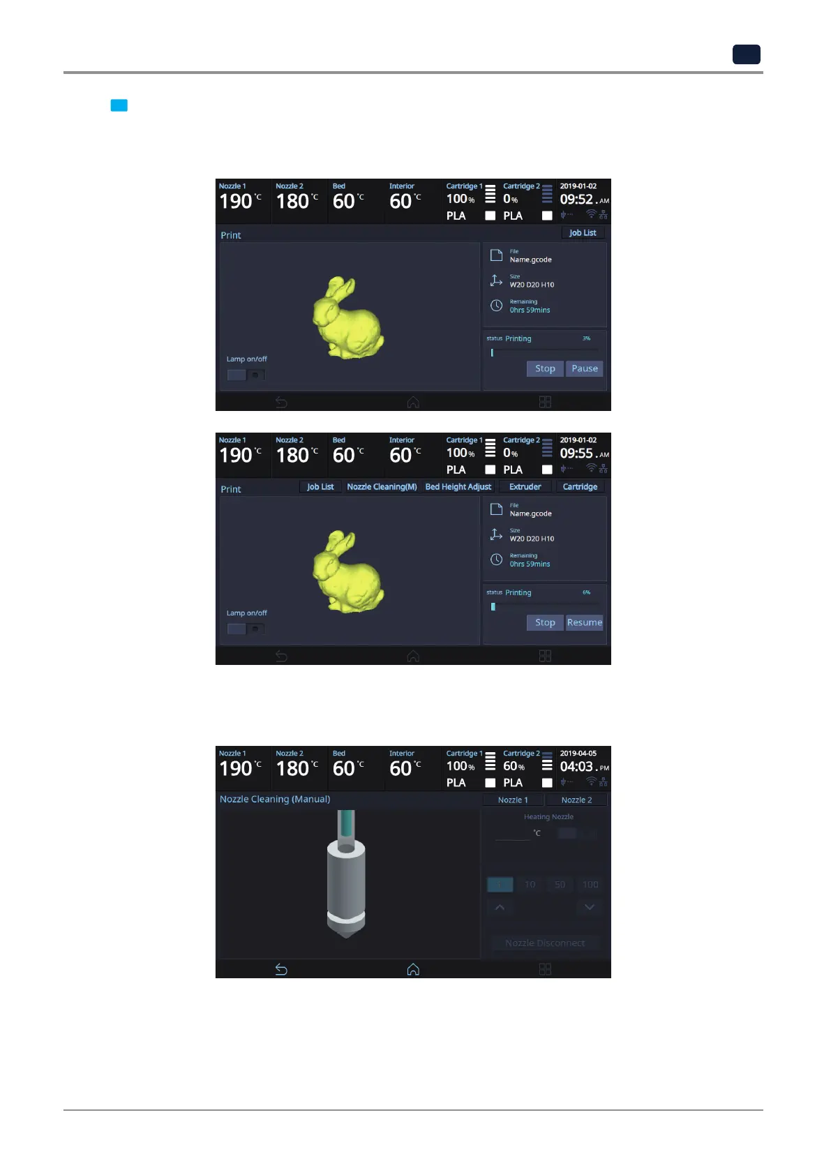 Additional functions include [Nozzle cleaning], [Bed Height Adjustment], [Extruder], [Cartridge] and so on.