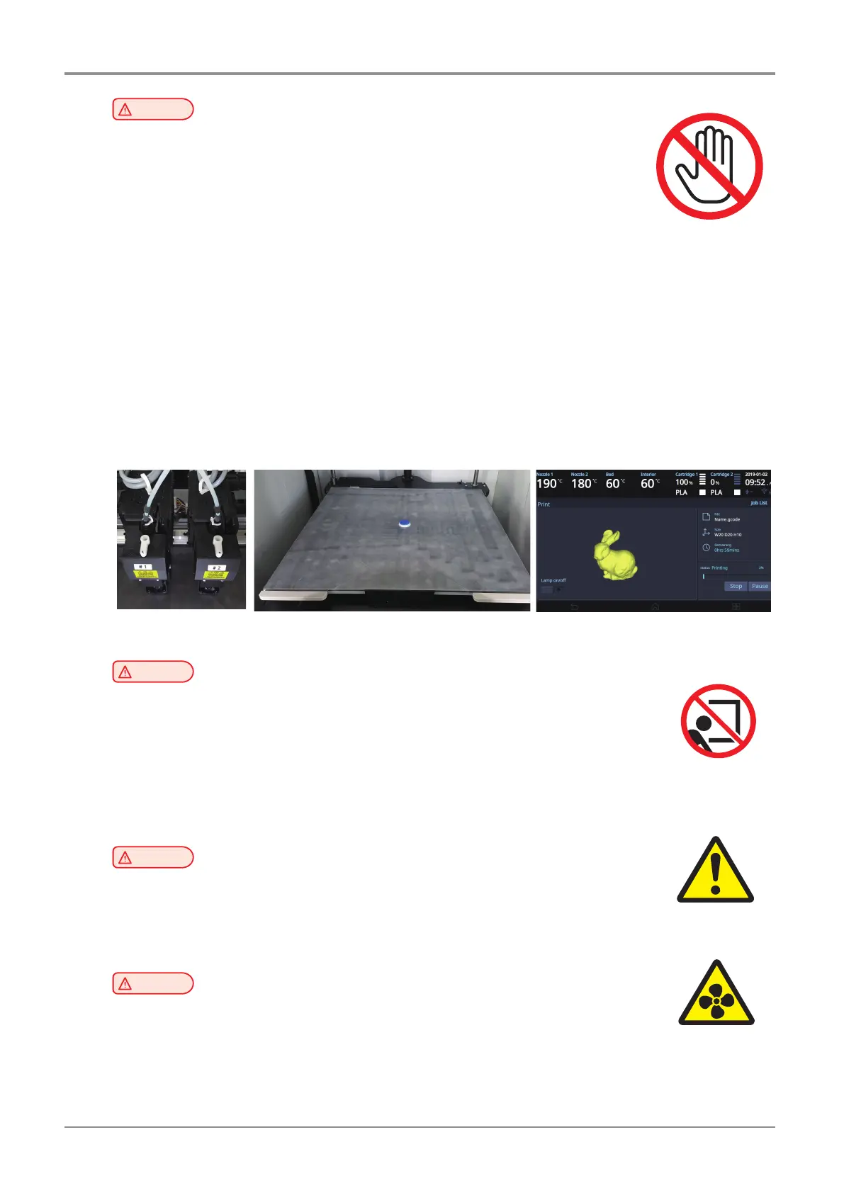 Do not put any portion of your body or objects during machine operation, as the bed, motor, nozzle