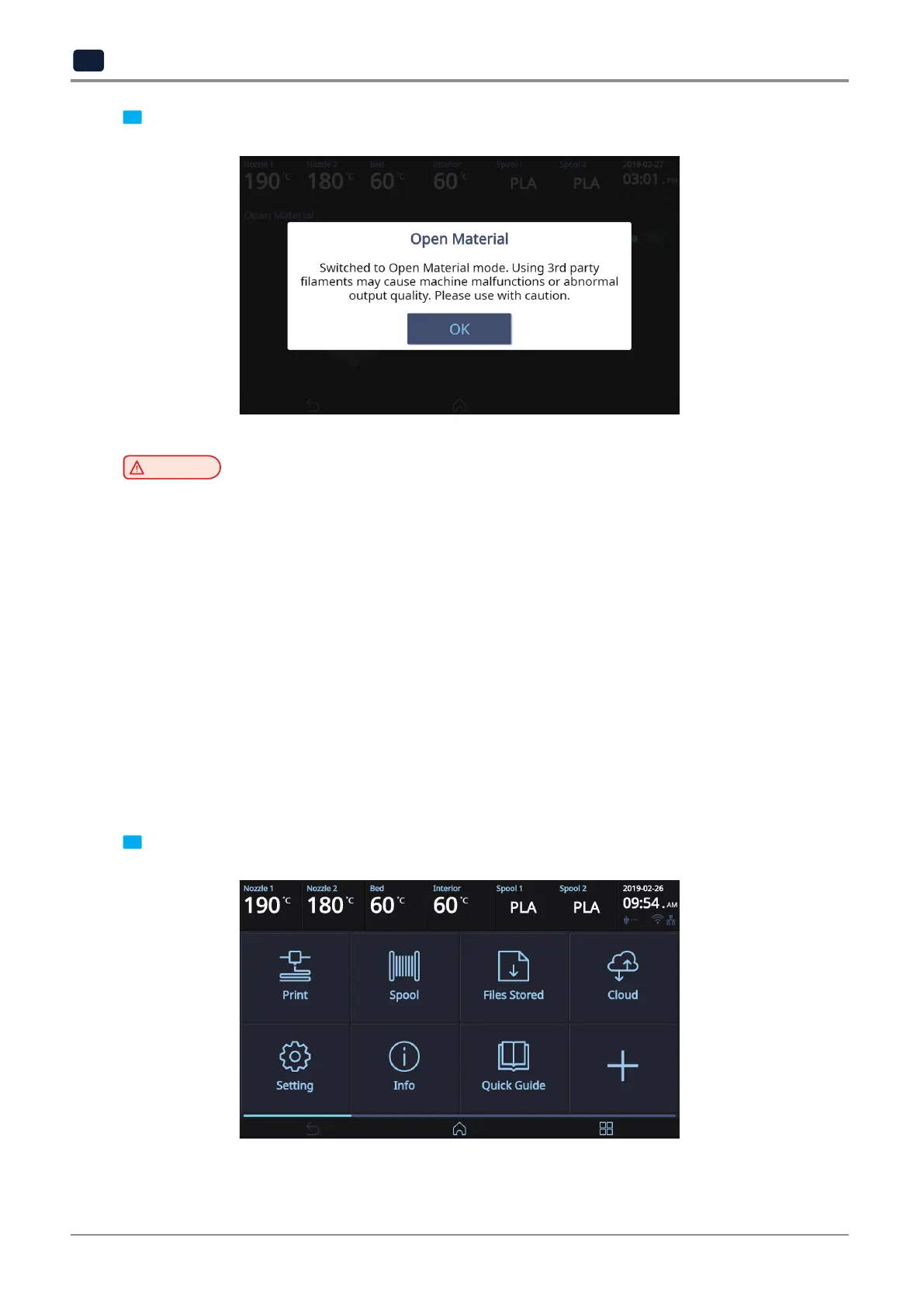 Improper usage of a third-party filament may cause device failure and poor printing quality.