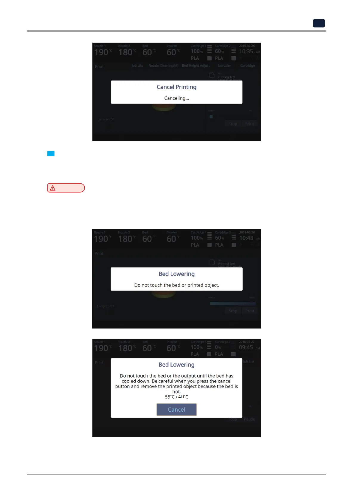 To remove the printed output before the bed is cold, press the [Cancel] button, wear protective gear, and