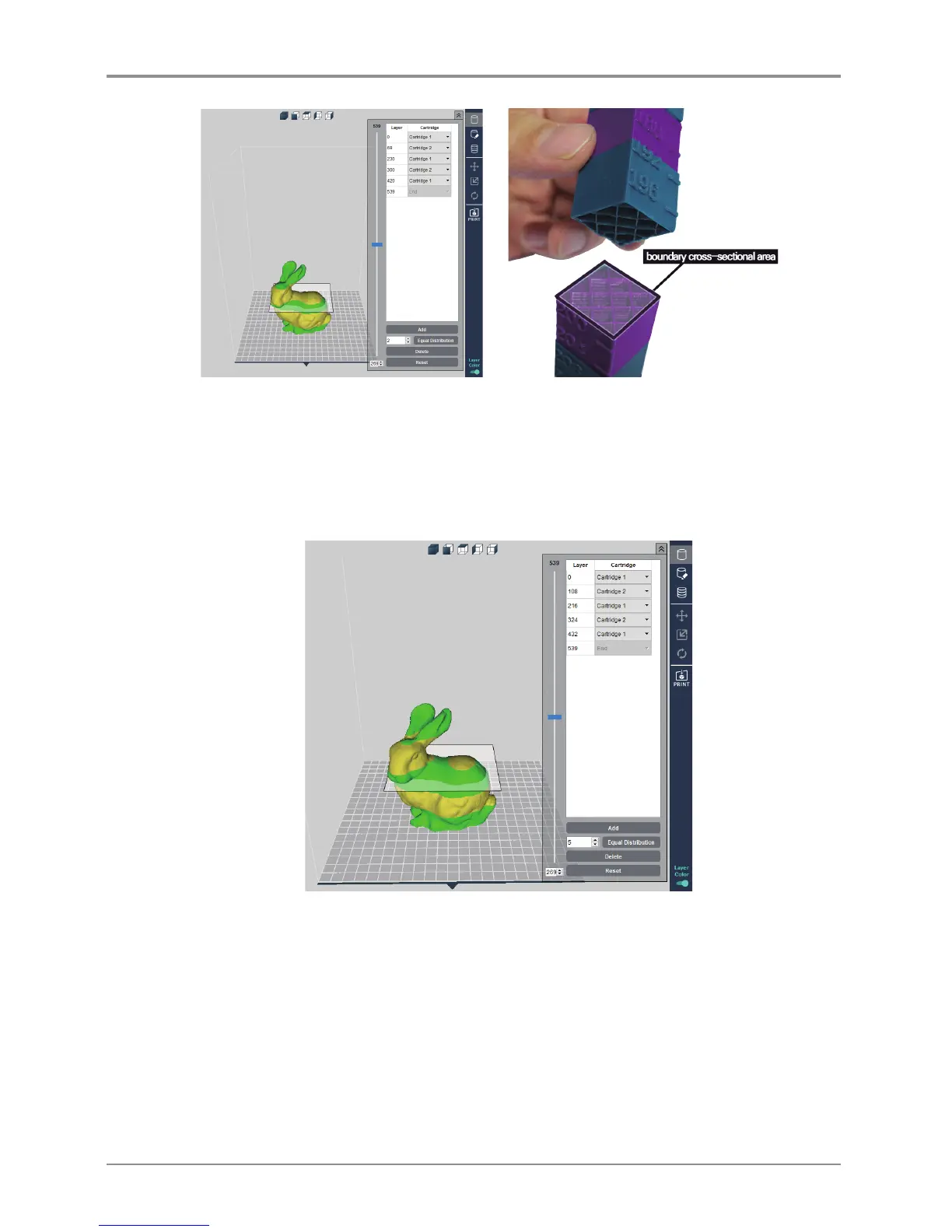 0th to 69th layers are printed by cartridge 1 and 69th to 230th layers are printed by cartridge 2.