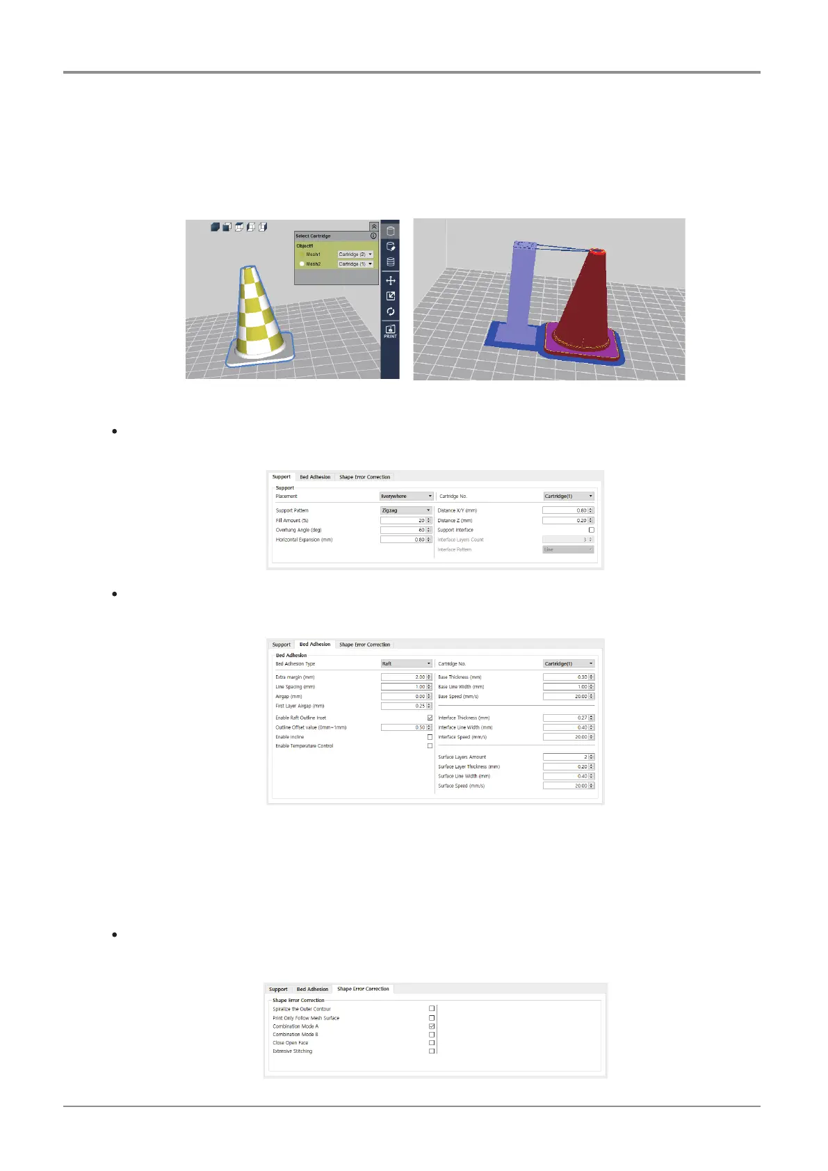 Shape error correction provides functions to correct mesh errors. (Ex: Printing along the mesh surface).