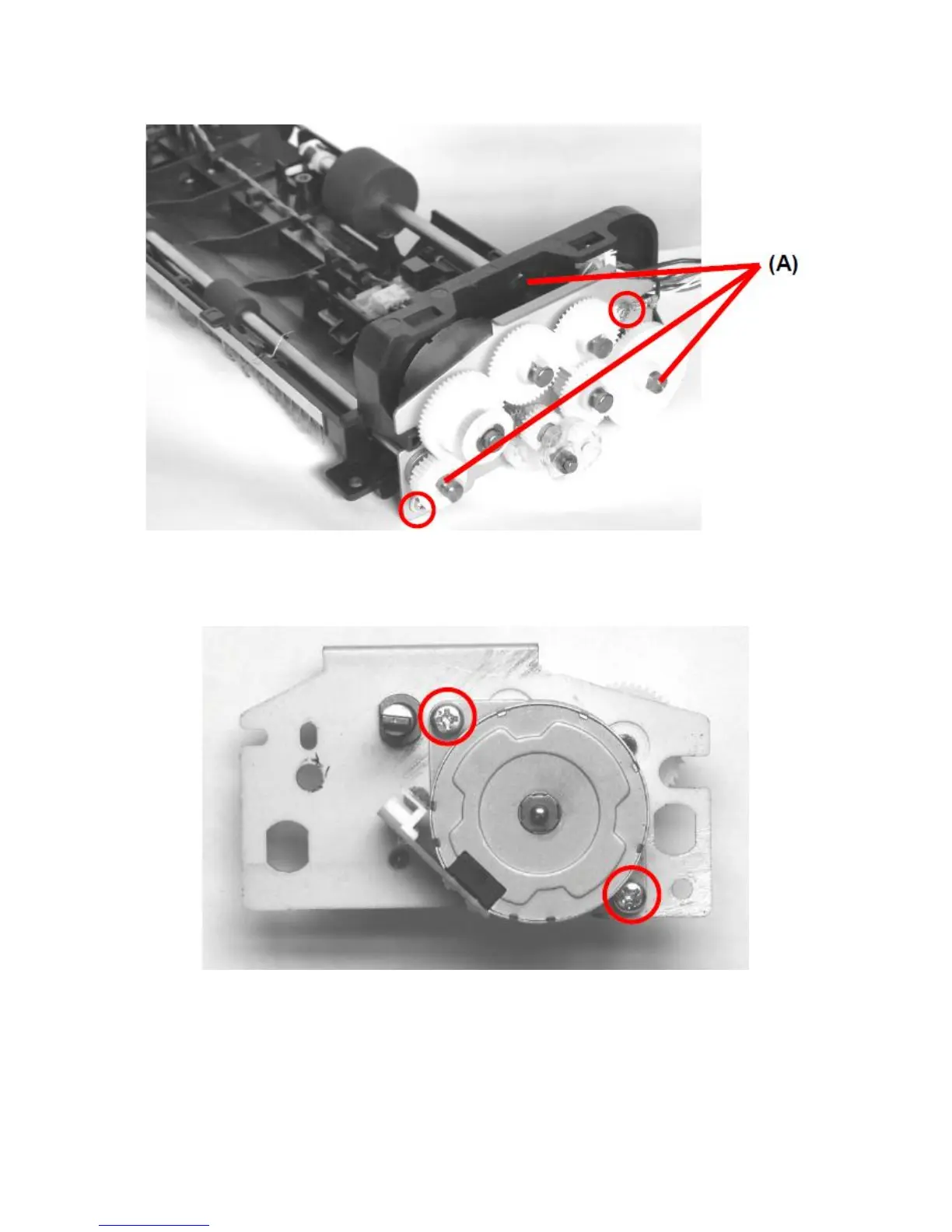 9. Remove 2 screws and unlock 3 hooks (A), and remove motor harness to remove ADF’s top guide and