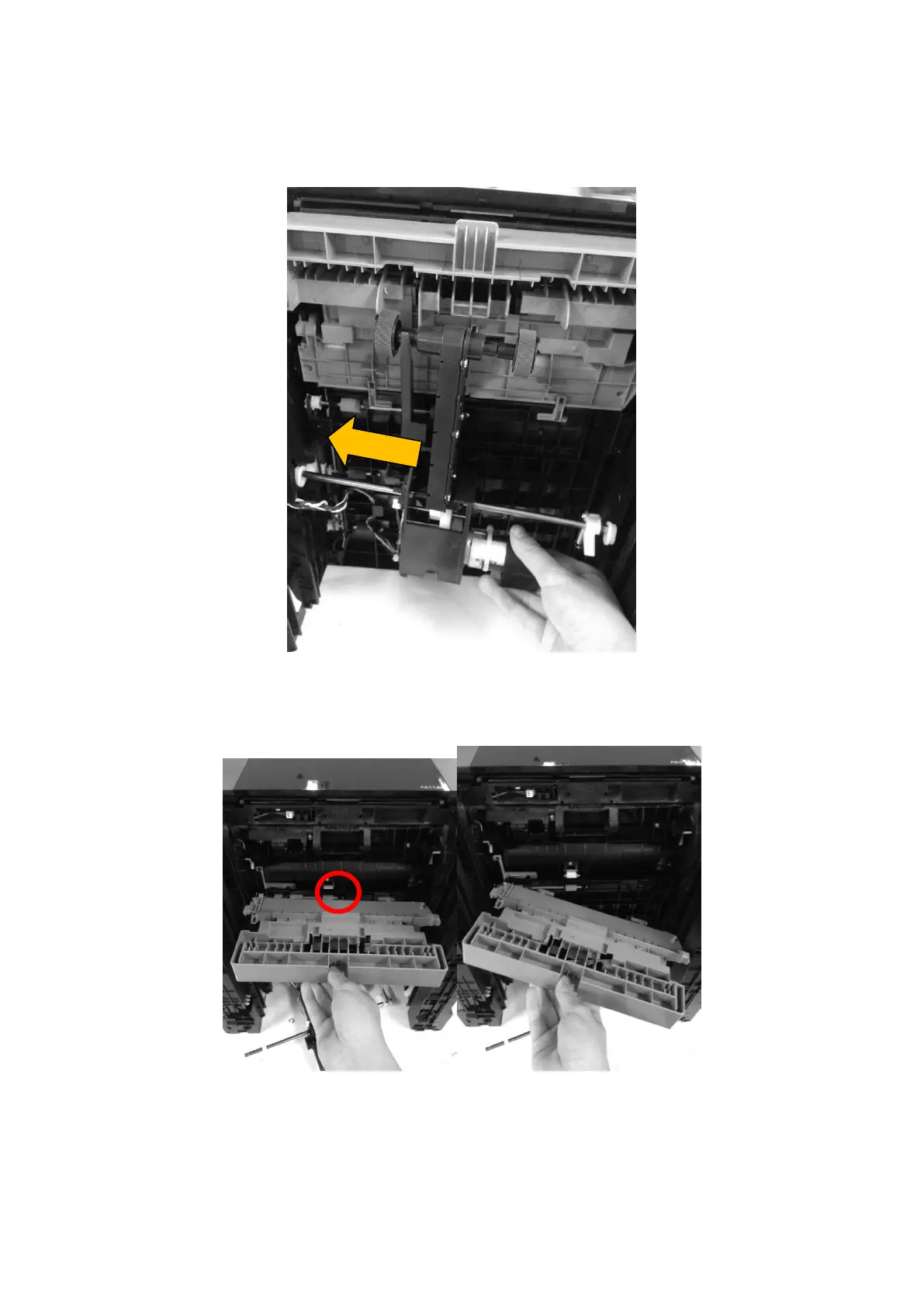 11. Make the jam remove cover vertically stand, and then pull out the right side hinge first.