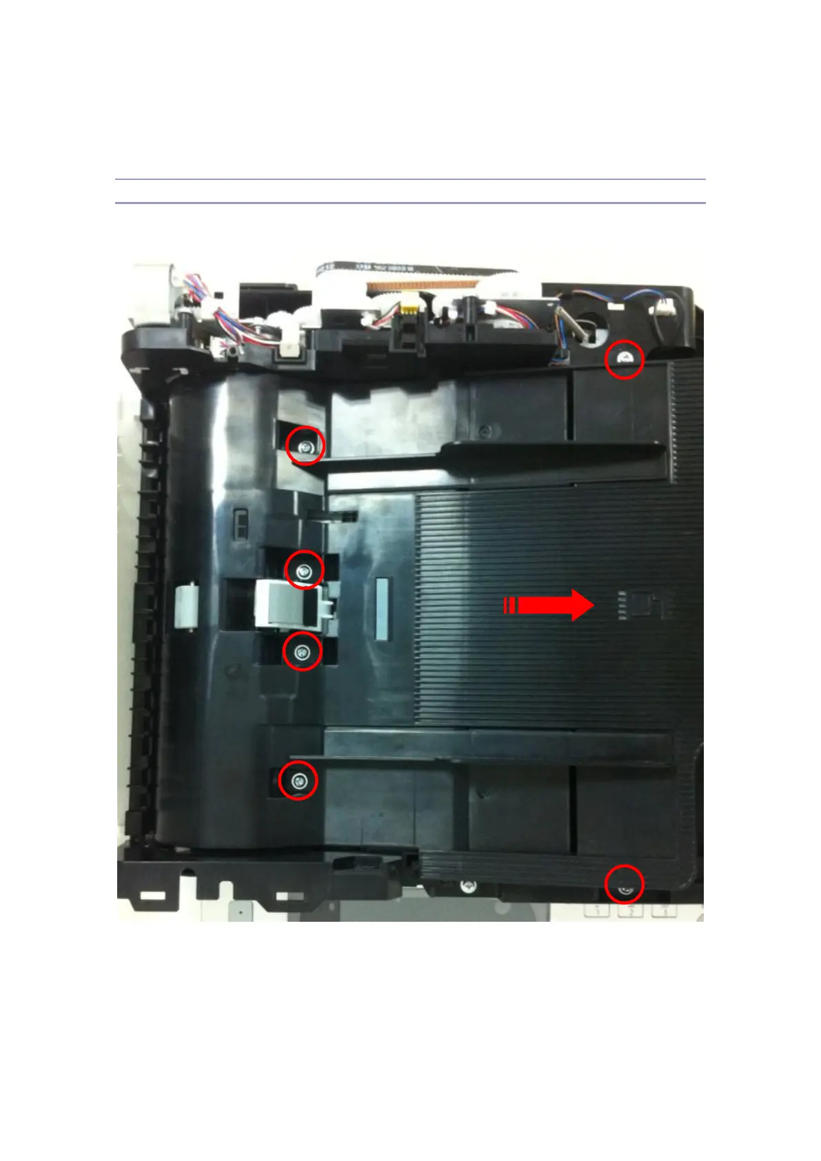 2. Remove 6 screws and ADF document tray assembly with pushing it in the arrow