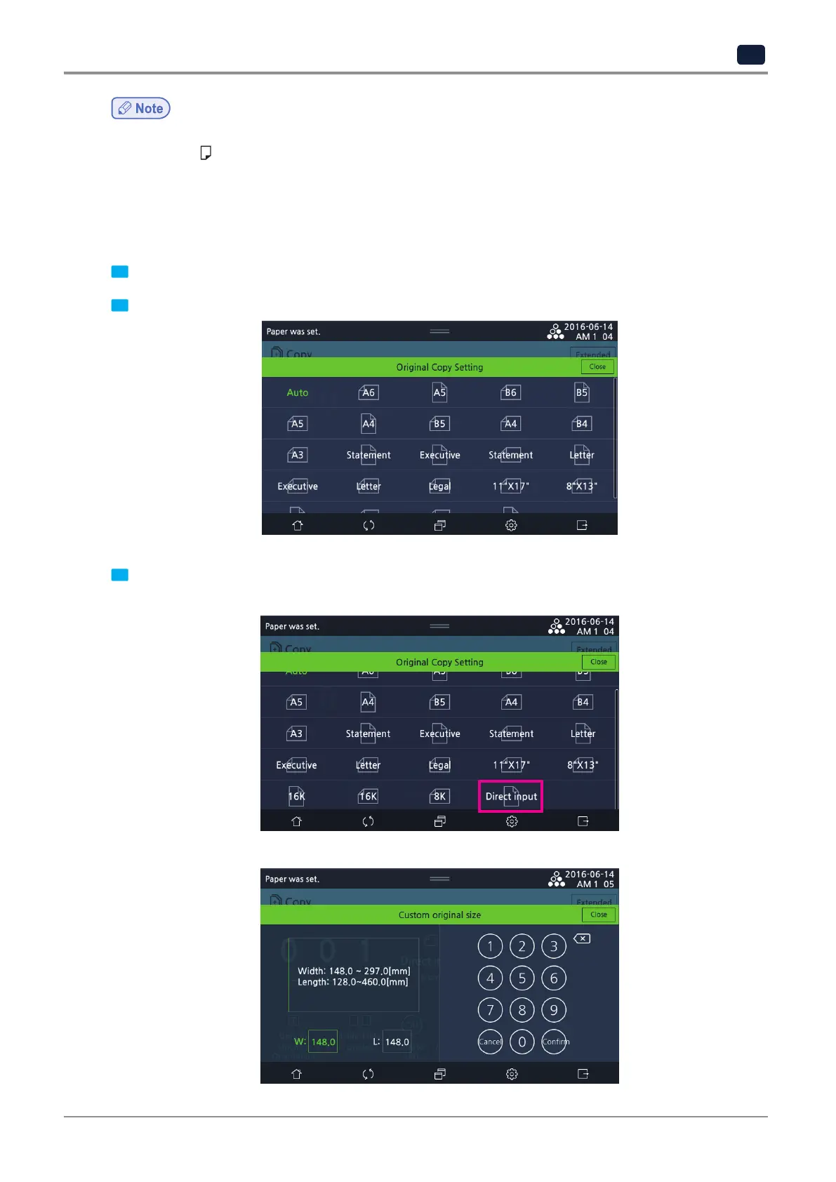 3 If the original is in non-standardized size, select [Direct input] on the LCD screen.