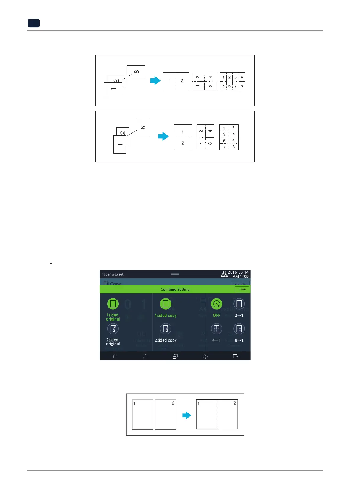 2, 4, 8 original pages can be combined to print on a single paper. (4, 8, 16 pages for duplex copy)